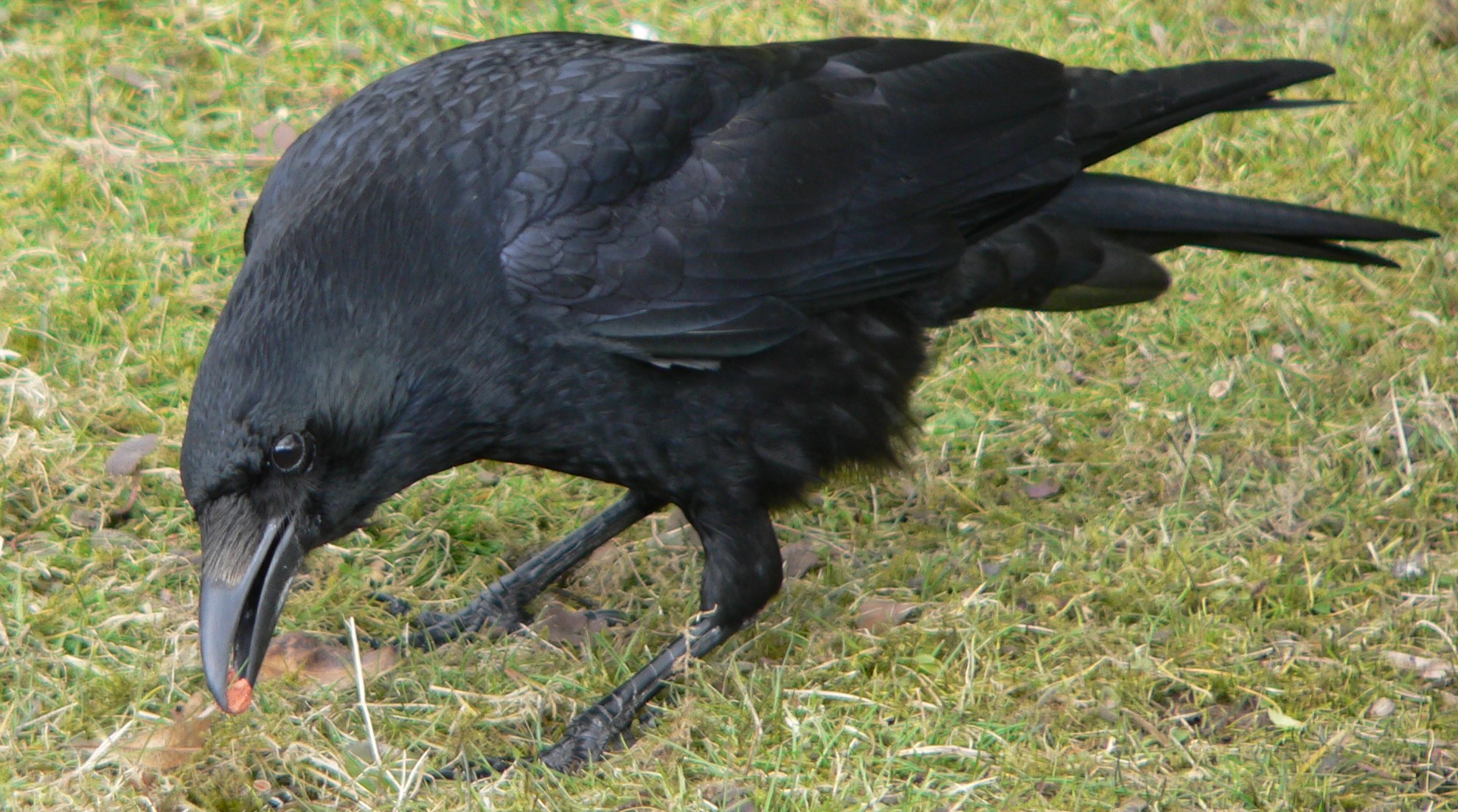 짧은 풀에서 작은 먹이를 쪼아 먹는 검은까마귀. 이 종은 습지 물떼새의 둥지를 습격하여 알과 새끼를 빼앗는다.