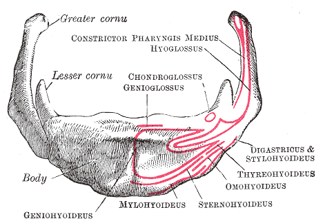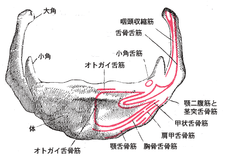 목뿔뼈에는 많은 수의 근육이 부착되어 있다.[13]- 위쪽