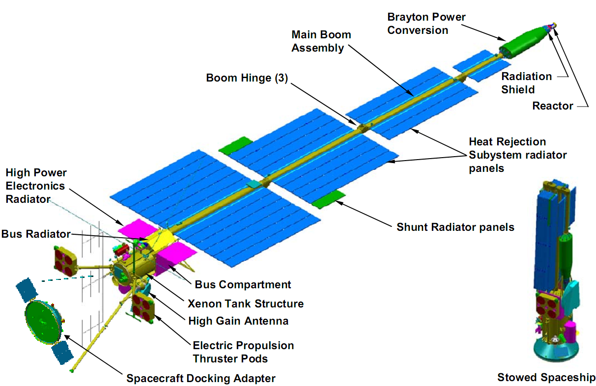 원자로는 민감한 우주선 장비들을 보호하는 강력한 방사선 방패 뒤, 우주선 끝부분에 부착될 예정이었다. 탐사선이 지구 궤도를 벗어나면 원자로가 전기를 공급하기 시작하며, 궤도에서 빨리 출발해야 원자로의 연료를 최대한 아낄 수 있었다. 이는 기존 외태양계 임무에 쓰였던 방사성동위원소 열전기 발전기보다 덜 위험할 것으로 생각되었다.[1]