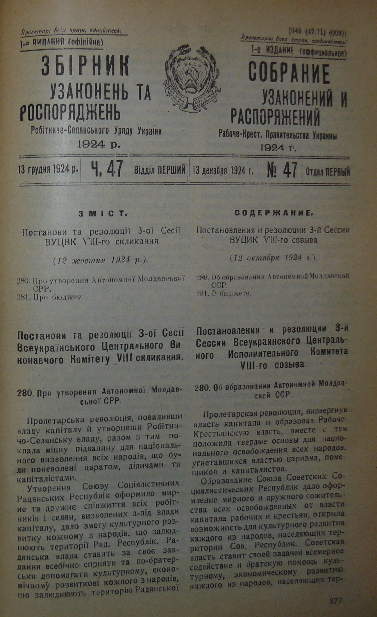 1924년 3월 7일, 우크라이나 공산당(b) 중앙 위원회 정치국은 몰도바 자치주 설치를 결정했다.[1] 이후 7월 29일에는 러시아 공산당(볼셰비키) 중앙 위원회는 우크라이나 소비에트 사회주의 공화국의 일부로 몰도바 인구를 특별 자치 공화국으로 할당하라는 지시를 내렸다.[1] 10월 12일, 전우크라이나 중앙 집행 위원회는 몰도바 자치 소비에트 사회주의 공화국(MASSR) 설립을 승인했다.[1]