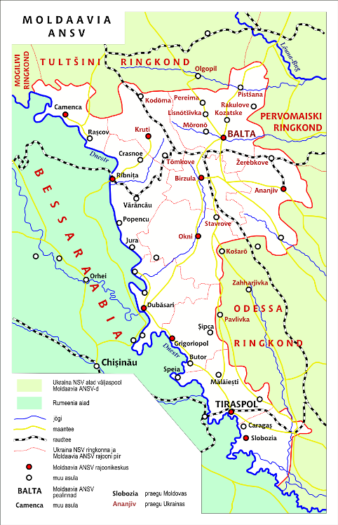 1940년 8월 2일, 소련은 몰도바 소비에트 사회주의 공화국(몰도바 SSR)을 설립했는데, 이는 베사라비아의 6개 군과 몰도바 ASSR의 가장 서쪽 지역을 합쳐서 몰도바 ASSR은 사실상 해체되었다.[19][15]