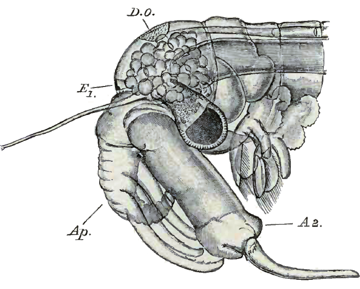 머리에는 두 개의 소화선과 작고 엽(葉) 모양의 위가 있으며, 소화선은 위로 연결된다.[6] 위는 긴 창자와 연결되고, 창자는 짧은 직장으로 이어져 미절에 있는 항문으로 끝난다.[6] 혈강은 길고 관 모양의 심장에 의해 혈액이 순환하며, 심장은 몸 길이의 대부분을 차지한다.[6] 혈액은 여러 틈새를 통해 심장으로 들어가고, 심장은 연동 운동을 통해 몸 앞쪽으로 혈액을 보낸다.[6] 신경계는 몸 전체 길이에 걸쳐 뻗어 있는 두 개의 신경삭으로 이루어져 있다. 대부분의 몸마디에는 두 개의 신경절과 이를 가로로 잇는 연결 부위가 있다.[6]기체 교환은 몸 전체 표면, 특히 엽각류와 관련된 아가미를 통해 이루어지는 것으로 보이며, 이는 삼투압 조절에도 관여하는 것으로 추정된다.[6] 턱 밑부분에 있는 두 개의 나선형 샘은 질소 폐기물을 주로 요소 형태로 배설하는 역할을 한다.[6] 하지만 질소 폐기물의 대부분은 암모니아 형태이며, 이는 엽각류와 아가미를 통해 주변 환경으로 배출되는 것으로 보인다.[6]