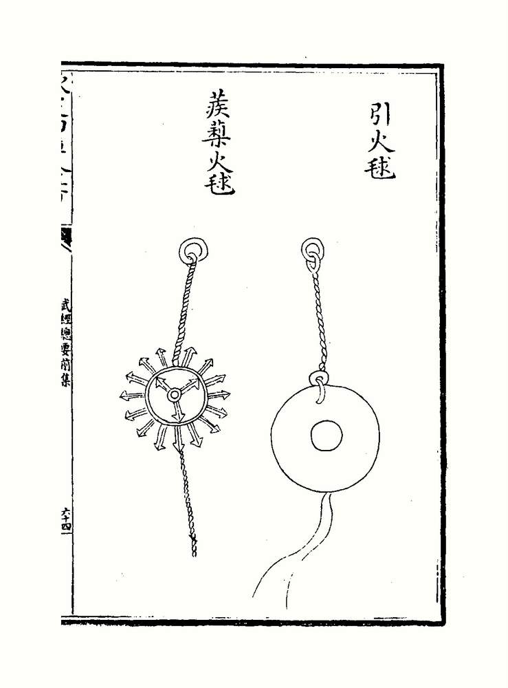 《무경총요》에는 화약 무기, 예컨대 방화 투사체, 연막탄, 화살, 수류탄에 대한 상세한 묘사가 기록되어 있다. 이 책에는 저질 질산염 화약을 함유한 방화 투사체가 기록되어 있는데,[1] 이는 투석기로 발사하거나 포위군에게 성벽에서 떨어뜨렸다.[2]