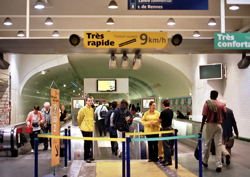 2002년 파리 몽파르나스-비앙브뉘 역에 설치된 고속 무빙워크는 일반 무빙워크보다 약 3배 빠른 속도(약 2.5m)로 운행되어 세계적인 주목을 받았다.[35] 이 무빙워크는 선단 및 종단 부근에 독립적으로 움직이는 롤러를 설치하여, 선단에서는 점점 빨라져 고속 컨베이어 부분에 연결되고, 종단에서는 점점 느려져 출구에 도달하는 구조였다. 그러나 너무 빠른 속도로 인해 승하차 시 넘어지는 사람이 속출하여 설치 4일 후인 7월 5일에는 일시 사용 중단되기도 하였다.