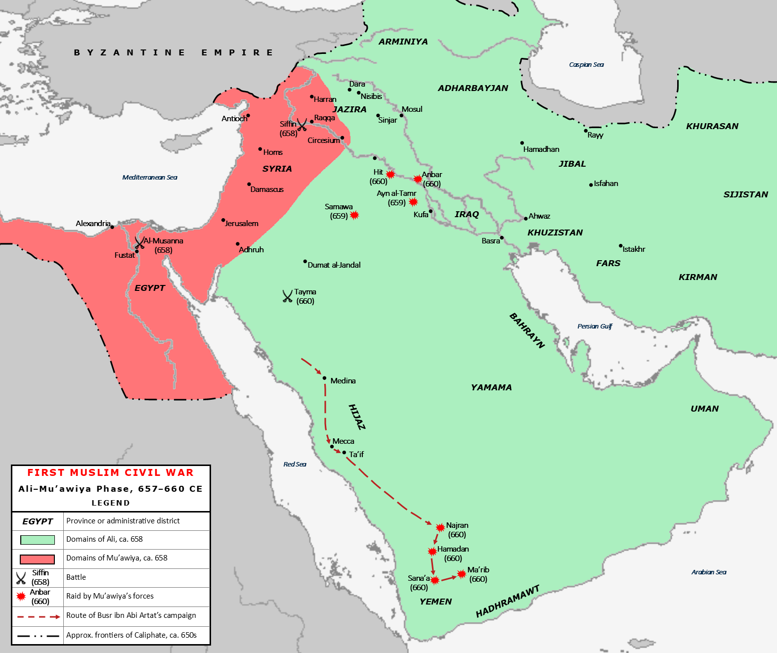 여름에 무아위야는 부스르 이븐 아비 아르타트를 지휘관으로 하는 대규모 군대를 헤자즈와 예멘 정복을 위해 파병했다. 그는 부스르에게 메디나 주민들을 해치지 않고 위협하고, 메카 사람들은 살려주고, 예멘에서 충성을 거부하는 사람은 모두 죽이라고 지시했다. 부스르는 메디나, 메카, 타이프를 거쳐 진격하면서 저항을 만나지 않고 그 도시들의 무아위야에 대한 인정을 받았다. 예멘에서는 부스르가 과거 우스만에 대한 비판이나 알리와의 유대 관계 때문에 나즈란과 그 주변 지역의 여러 유명 인사들을 처형하고, 함단 부족의 수많은 부족민들과 사나와 마리브의 도시 주민들을 학살했다. 하드라마우트에서 그의 원정을 계속하기 전에 그는 쿠파 구원군의 접근에 따라 철수했다. 아라비아에서 부스르의 행동에 대한 소식은 알리의 군대가 무아위야에 대한 그의 계획된 원정을 지지하도록 자극했지만, 661년 1월 하리지파에 의한 알리 암살로 인해 원정은 중단되었다.