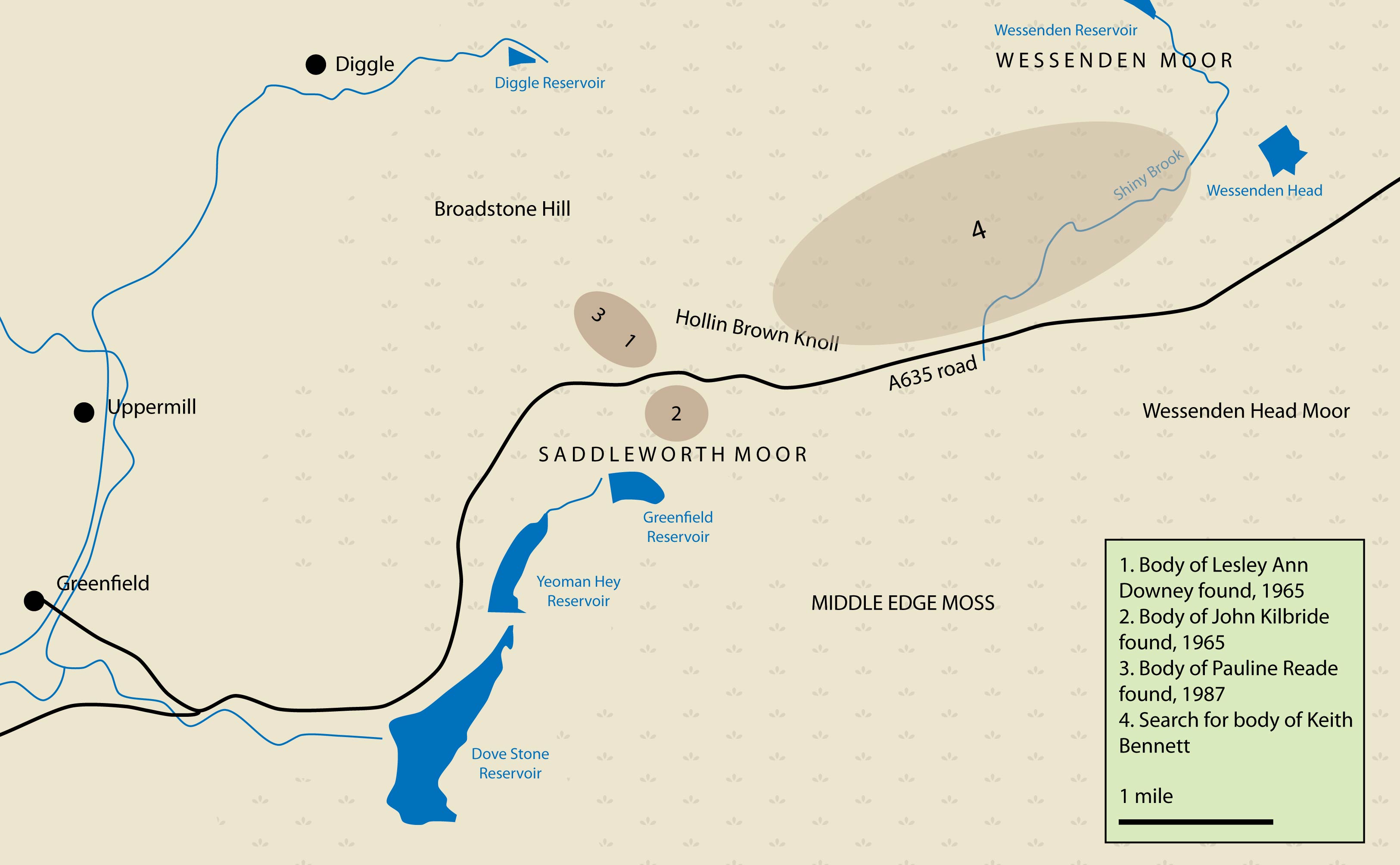 경찰은 브래디와 힌들리가 여러 차례 새들워스 무어에 데려갔던 호지스에게 말을 걸었고, 그는 A635 도로를 따라 그들이 가장 좋아했던 장소를 가리킬 수 있었다. 경찰은 즉시 해당 지역을 수색했고, 10월 16일에는 이탄에서 뼈가 튀어나온 것을 발견했다. 처음에는 킬브라이드의 것으로 추정되었지만, 다음 날 다우니의 것으로 확인되었다.[9]