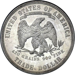 미국의 무역은 ''트레이드 달러(Trade dollar)''는 1873년부터 1885년까지 미국 조폐국이 필라델피아, 카슨시티, 샌프란시스코 조폐국에서 발행했으며 무게는 27.2g, 순도는 90%였다. 트레이드 달러가 쓰이기 전에 미국은 중국과의 무역에서 은화로 주로 멕시코 페소를 썼는데, 미국 의회는 동아시아, 특히 중국과의 무역을 개선하기 위해 미국 조폐국에게 트레이드 달러를 발행할 권한을 주었다.[5] 중국의 상인들은 은화의 정확한 무게와 가치를 확인하기 위해 은화에 각인을 했기 때문에 많은 트레이드 달러들은 각인이 찍혔다.[6]
