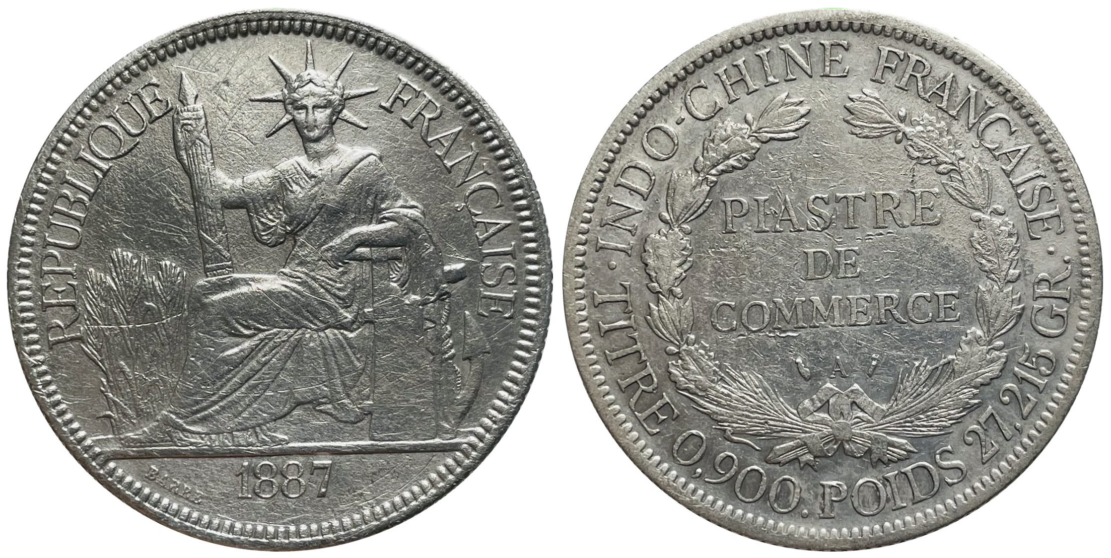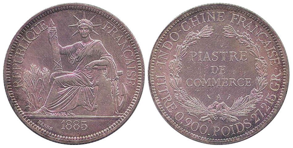 1885년부터 프랑스는 미국 무역 은화와 동일한 420그레인(27.215그램)의 무역 은화를 발행했다. 이 무역 은화는 피아스트르(PIASTRE) 액면 및 품위 0.900, 중량 27.215GR로 표기되었다. 그러나 멕시코 달러가 널리 사용되었고, 이 무역 피아스트르는 미국 및 일본의 무역 은화와 마찬가지로 널리 유통되지 못했기 때문에, 1895년부터 중량을 27.00그램으로 감량하여 1928년까지 발행되었다. 이후 차츰 널리 유통되게 되었다.[3]