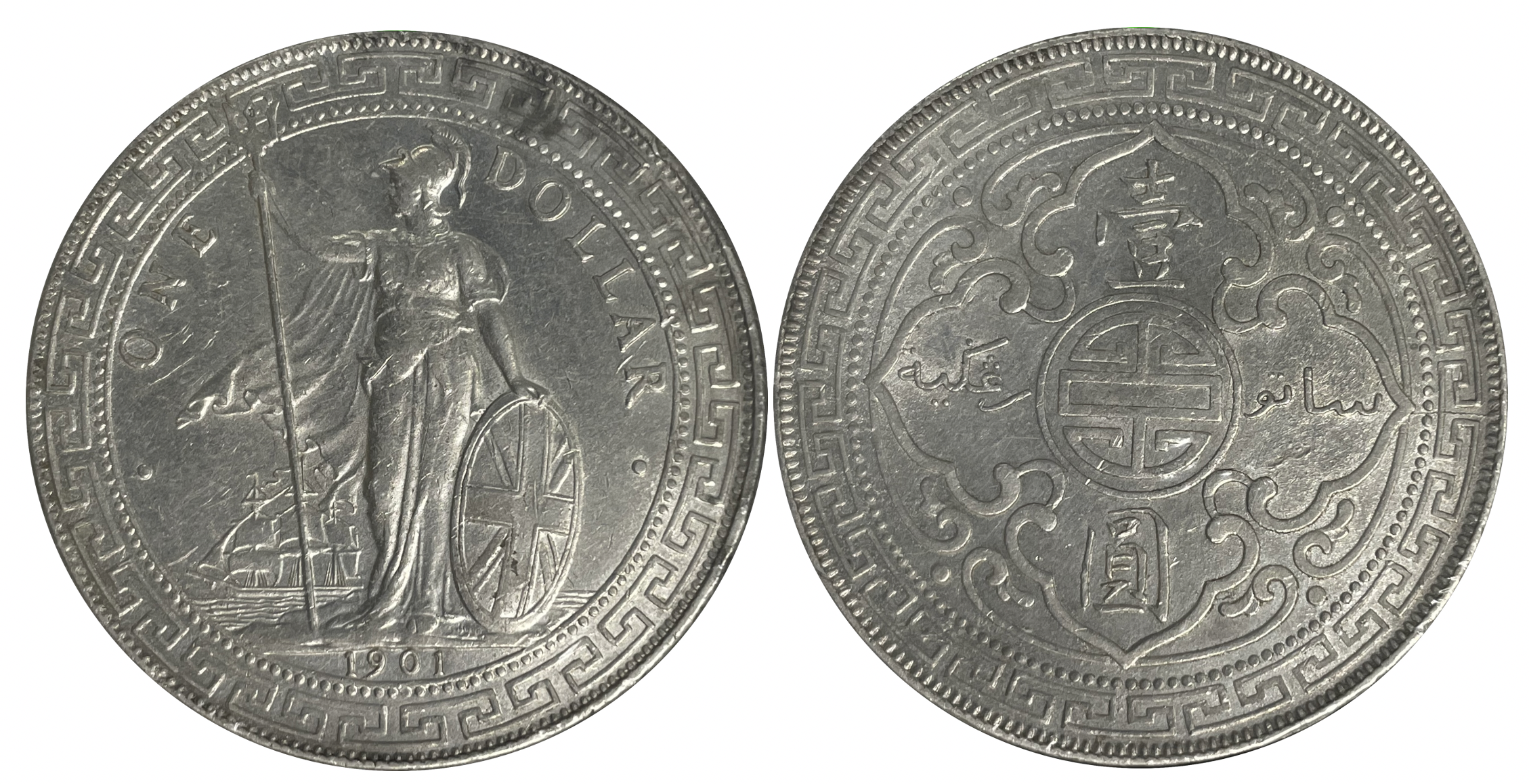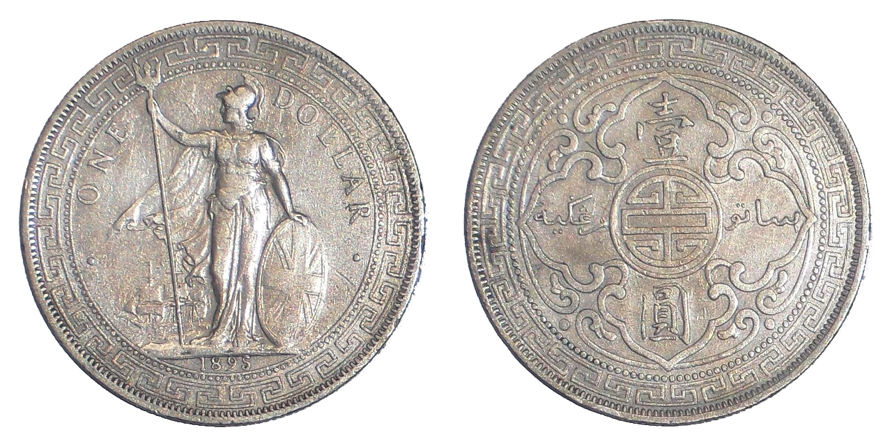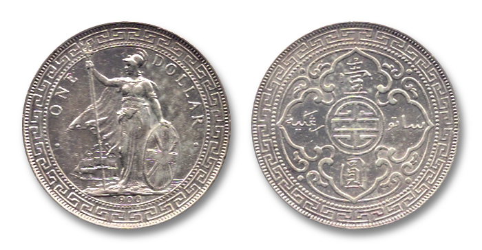 제1차 아편 전쟁과 제2차 아편 전쟁 결과, 청나라는 영국에 항구를 개방하고 홍콩을 양도해야 했다. 이후 청나라 개항지와 영국령 홍콩에는 많은 상인들이 몰려들어 무역이 활발해졌고, 외국 은행들이 설립되어 차, 명주, 도자기 등을 구매하기 위한 자금으로 세계 각지의 은화들이 사용되었다. 동아시아 지역에서 사용하기 위해 발행된 영국의 무역은, 즉 ''트레이드 달러(Trade dollar)''는 앞면에 삼지창과 방패를 든 브리타니아가 해안가에 서 있는 모습과 무역선이 함께 그려져 있었고, 뒷면에는 아라베스크 문양과 중국 전통 문양, 그리고 한자와 자위 문자로 액면가가 표기되어 있었다.