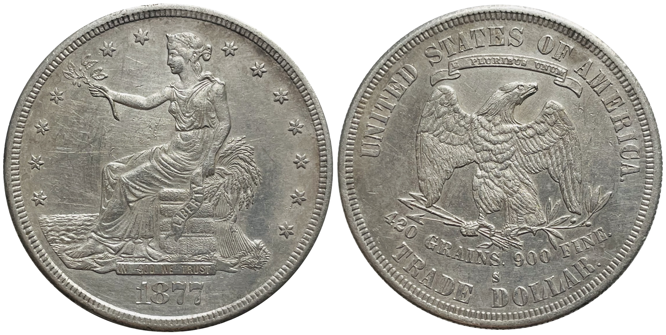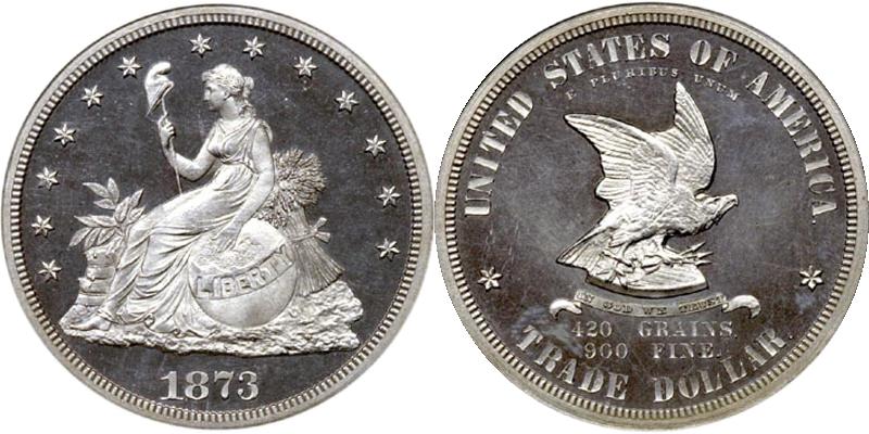 미국에서는 동양, 특히 중국과의 무역을 발전시키기 위해 1873년부터 기존의 1달러 은화의 중량 26.73g에서 27.22g으로 증량한 '''무역 은화'''가 발행되었다. 필라델피아, 카슨시티, 샌프란시스코의 조폐국에서 제조되었다.