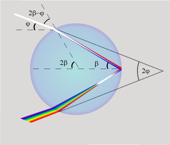 햇빛이 빗방울에 닿으면 빛의 일부는 반사되고 나머지는 빗방울로 들어간다. 빛은 빗방울 표면에서 굴절된다. 이 빛이 빗방울 뒤쪽에 닿으면 일부는 뒤쪽에서 반사된다. 내부적으로 반사된 빛이 다시 표면에 도달하면 다시 일부는 내부적으로 반사되고 일부는 물방울에서 빠져나가면서 굴절된다. 전체적인 효과는 입사하는 빛의 일부가 0°에서 42° 범위로 반사되어 약 42°에서 가장 강한 빛을 낸다는 것이다.[20] 이 각도는 물방울의 크기와 무관하지만 굴절률에 따라 달라진다. 해수는 빗물보다 굴절률이 더 높으므로 바닷물 안개 속 "무지개"의 반경은 실제 무지개보다 작다. 이것은 이러한 무지개의 불일치로 육안으로 볼 수 있다.[21]반사된 빛이 약 42°에서 가장 강한 이유는 이 지점이 변곡점이기 때문인데, 간단히 말하면 42° 부근에서 빛이 가장 많이 반사된다고 이해하면 된다.
