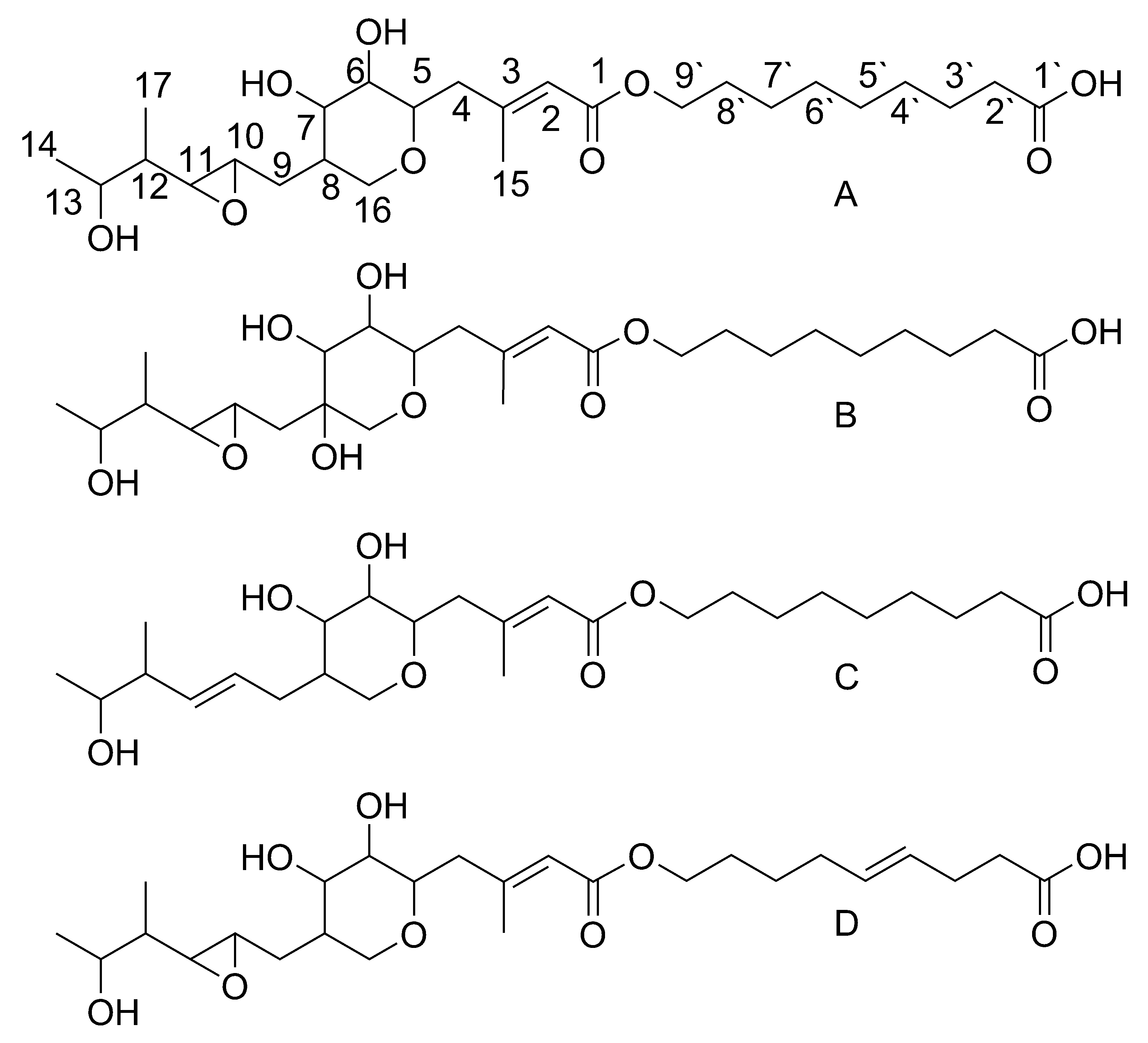 - 유사모닉산 C: C10과 C11 사이에 이중 결합이 있으며, PA-A의 에폭사이드는 없다.[28]