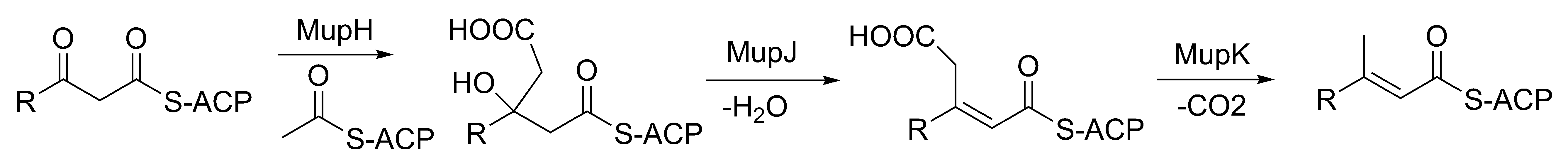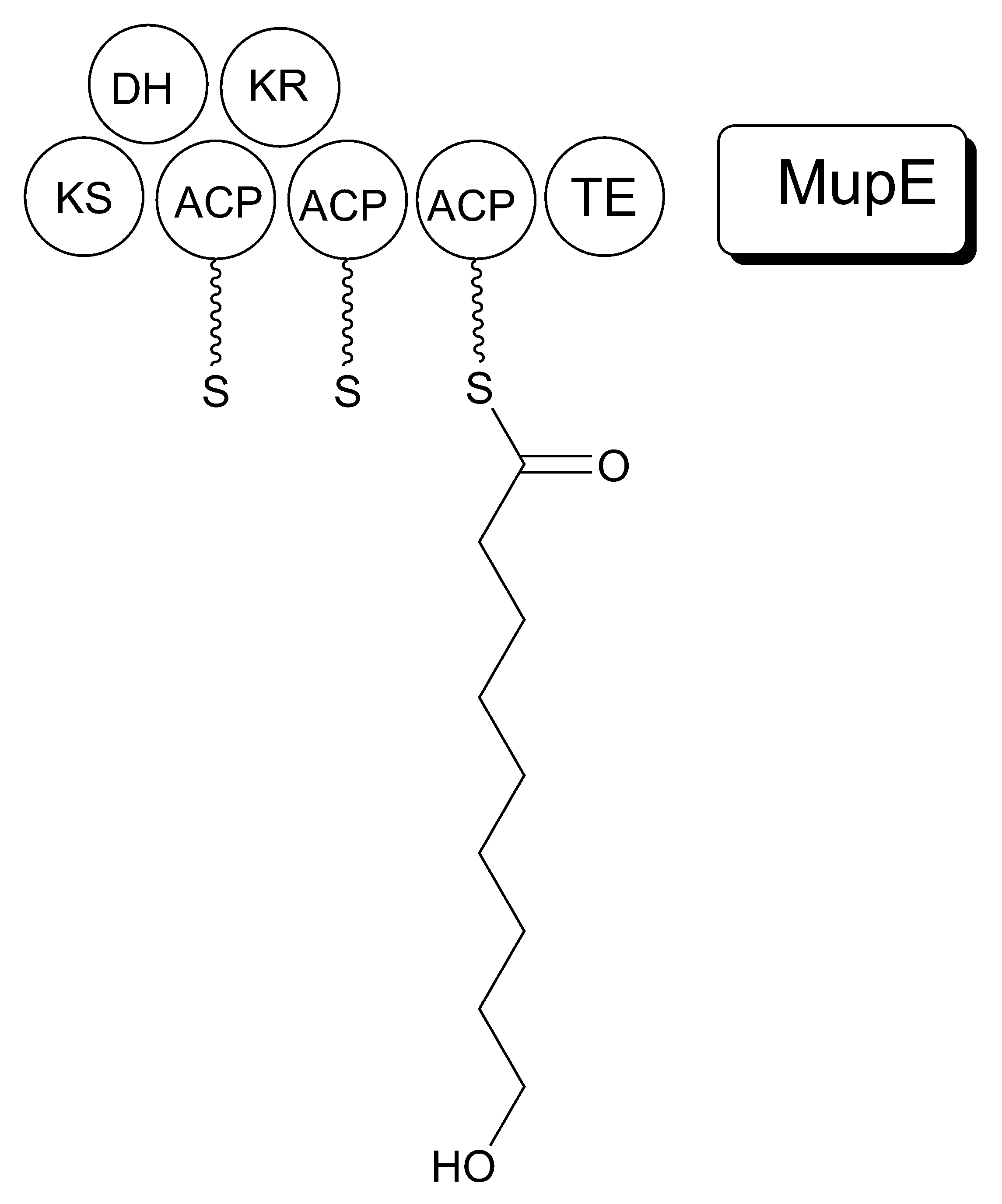- '''9-히드록시노난산(9-Hydroxynonanoic acid) 생합성''': 9-HN은 MmpB에 의해 합성되며, MupE가 반응을 완료하는데 필요하다.