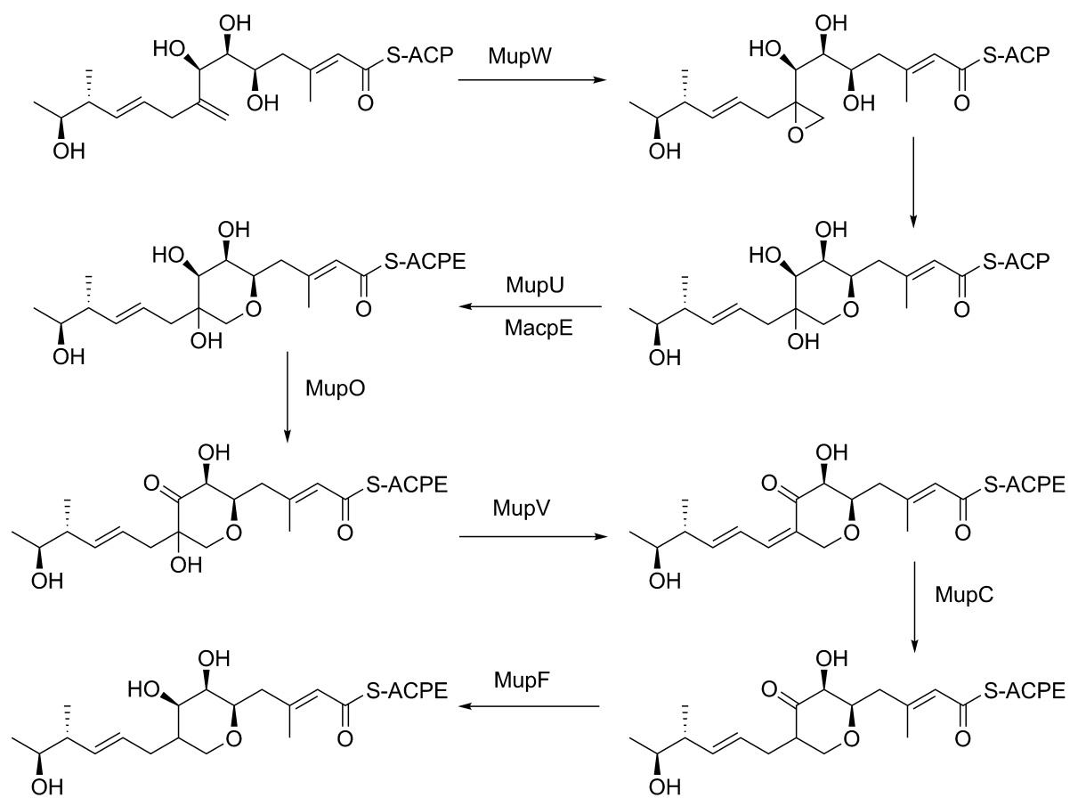 C3 위치의 케토기는 여러 단계의 반응을 거쳐 메틸기로 치환된다. MupG는 탈카복실화 반응을 통해 말로닐-ACP를 시작한다. 생성된 아세틸-ACP의 알파 탄소는 MupH에 의해 폴리케타이드 사슬의 C3에 연결된다. 이 중간체는 각각 MupJ와 MupK에 의해 탈수 및 탈카복실화된다.[30]피란 고리의 형성은 많은 효소 매개 단계를 필요로 한다. C8과 C9 사이의 이중 결합은 C8과 C16 사이로 이동하는 것으로 추정된다.[32] mupO, mupU, mupV 및 macpE의 유전자 제거 실험을 통해 PA-A 생성이 제거되었다.[32] PA-B 생성은 이러한 제거에 의해 제거되지 않아 PA-B가 PA-A를 수산화하여 생성되지 않음을 보여준다. mupW의 제거는 피란 고리를 제거하여 MupW가 고리 형성에 관여함을 확인했다.[32]