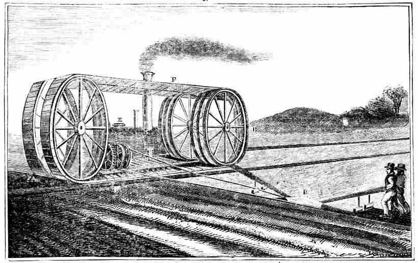 같은 시기 영국에서는 존 히스코트가 1832년 증기 경운기에 대한 특허를 얻어 1837년 시연했다. 이 경운기는 양 끝의 드럼으로 구동되는 철제 밴드에 약 2.13m 길이의 나무 조각을 볼트로 고정시킨 형태의 연속 궤도를 사용했다.[3] 30ton에 달하는 무게에도 불구하고 넓은 궤도 덕분에 지면 압력은 178lb/sqft 정도로 낮았다. 1837년 4월 볼턴 인근에서 성공적인 시연이 이루어졌으나, 이후 기계가 늪에 빠져 유실되고 자금 부족으로 개발이 중단되었다.[4][5]