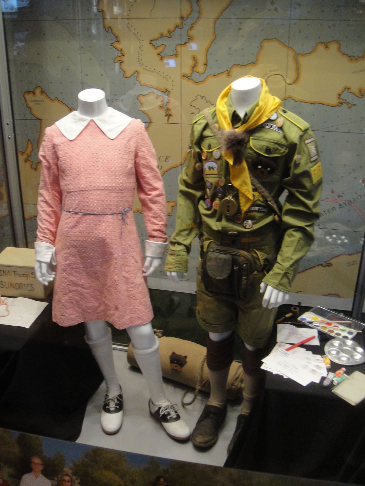 의상 디자이너는 카시아 발리카-마이몬이었다. 앤더슨은 그녀에게 등장인물들의 모습에 대한 컨셉을 제시했고, 그녀는 1960년대 사진과 보이스카우트 유니폼을 참고하여 수지와 샘의 의상을 디자인했다.[22] 영화 제작진은 실제 ''노예스 플루데'' 프로덕션의 동물 의상을 모델로 삼으려 했으나, 앤더슨의 전 학교 사진을 참고하여 미국 학교를 위해 만들어진 것처럼 제작하기로 결정했다.[21]
