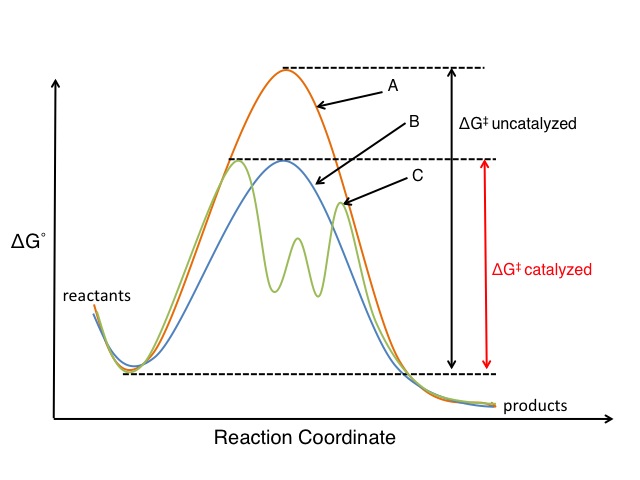 비촉매 반응(주황색 곡선 A)과 촉매 반응(파란색 곡선 B)을 나타낸다. 촉매 반응은 활성화 에너지가 낮다. 갈색 곡선 C는 다른 반응 메커니즘으로 진행되는 복잡한 반응 경로를 나타내며, 두 개의 반응성 중간체를 포함한다.