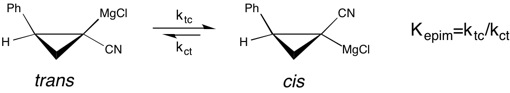 화학 평형의 용매 효과 연구에 대한 현대적인 예로서, 키랄의 사이클로프로필 니트릴 그리냐르 시약의 에피머화 연구가 있다.[18] 이 연구에 따르면 그리냐르 시약의 시스-트랜스 이성화의 평형 상수는, THF가 반응 용매일 때 매우 크고(''시스형으로 평형이 기울어짐''), 다이에틸 에테르가 용매일 때보다 우위에 있다. 그러나, THF에서의 시스-트랜스 이성화 속도가 빠르기 때문에, 입체화학적인 순도를 유지할 수 없다. 이 경우, 비대칭 합성에서 관찰되는 선택성에 관해, 반응 용매가 시약의 입체 배치의 안정성에 미치는 영향을 이해하는 것이 중요하다.