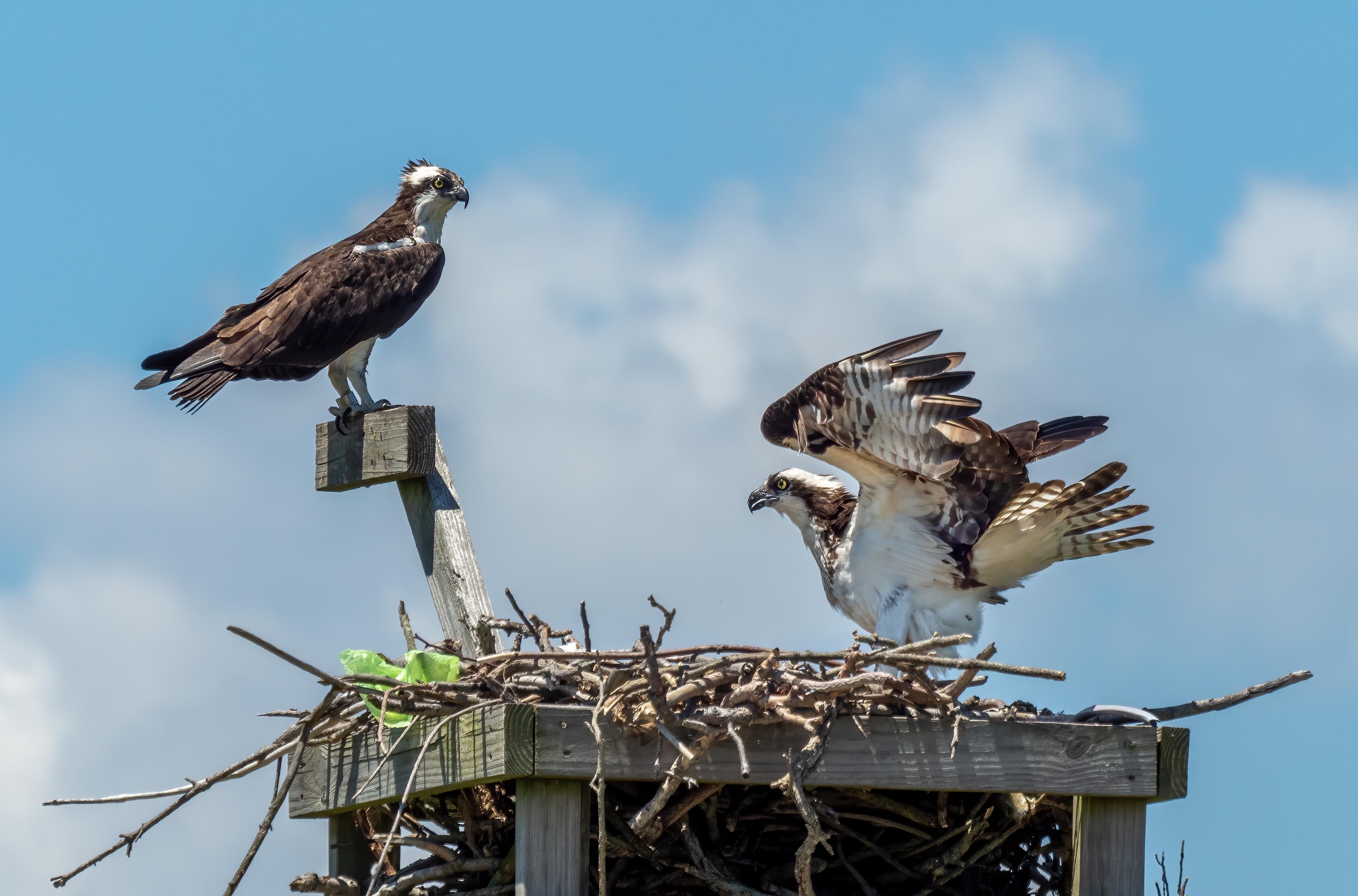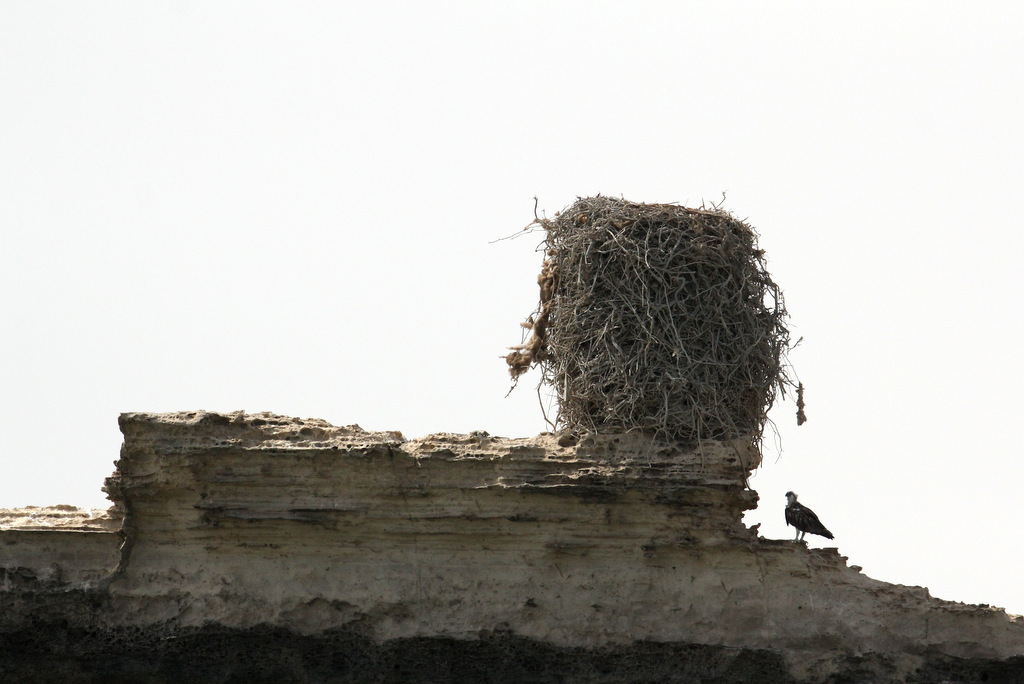 둥지는 주로 나무, 암석 노두, 전신주, 인공 플랫폼 또는 해안 섬의 갈라진 틈에 나뭇가지, 유목, 잔디, 해초 등을 쌓아 만든 거대한 구조물이다. 둥지의 크기는 너비가 2m에 달하고 무게가 약 135kg에 이르기도 한다. 특히 전신주 위에 지어진 큰 둥지는 화재 위험이 있고 정전을 일으킬 수 있다.[19]