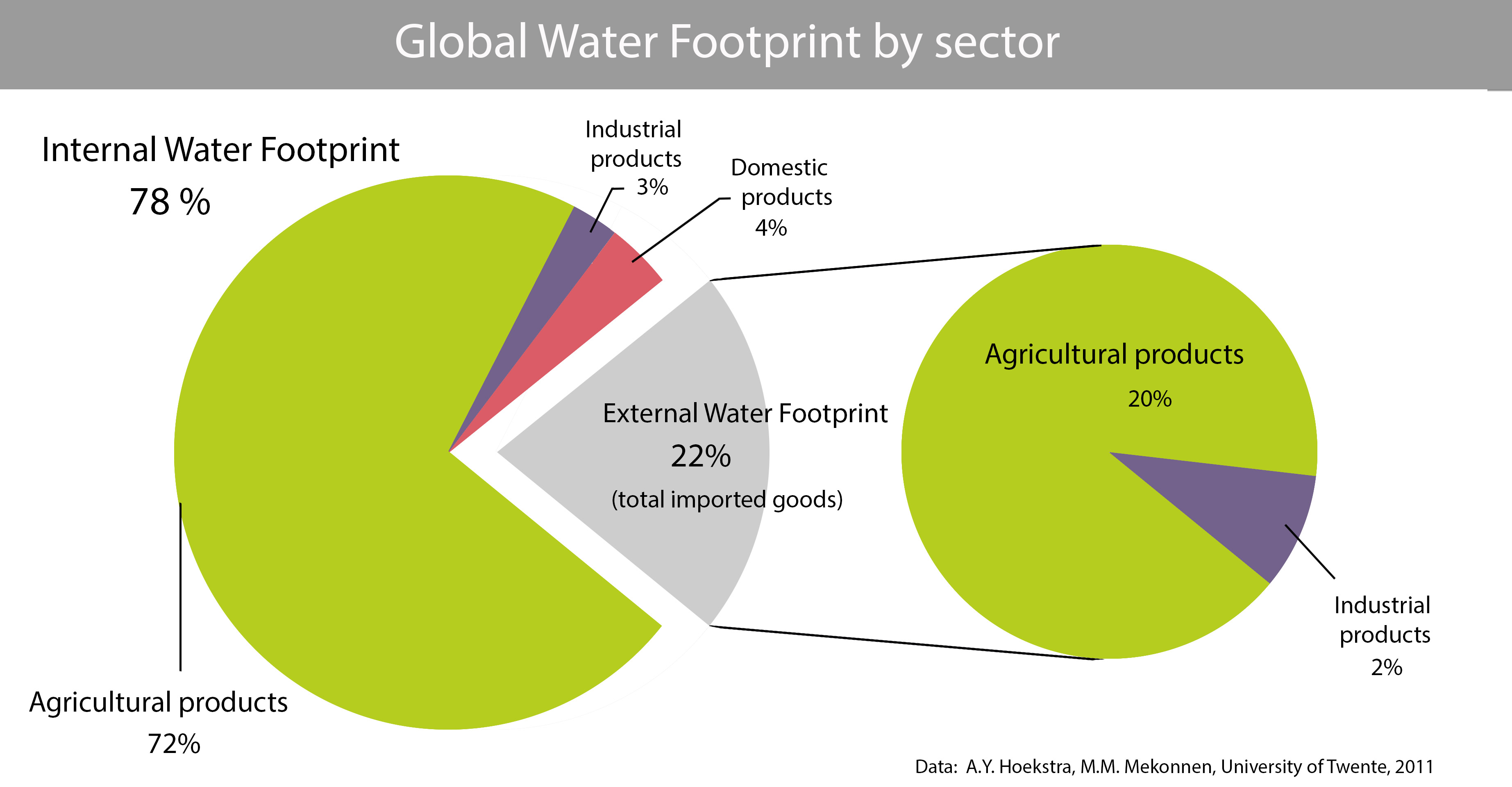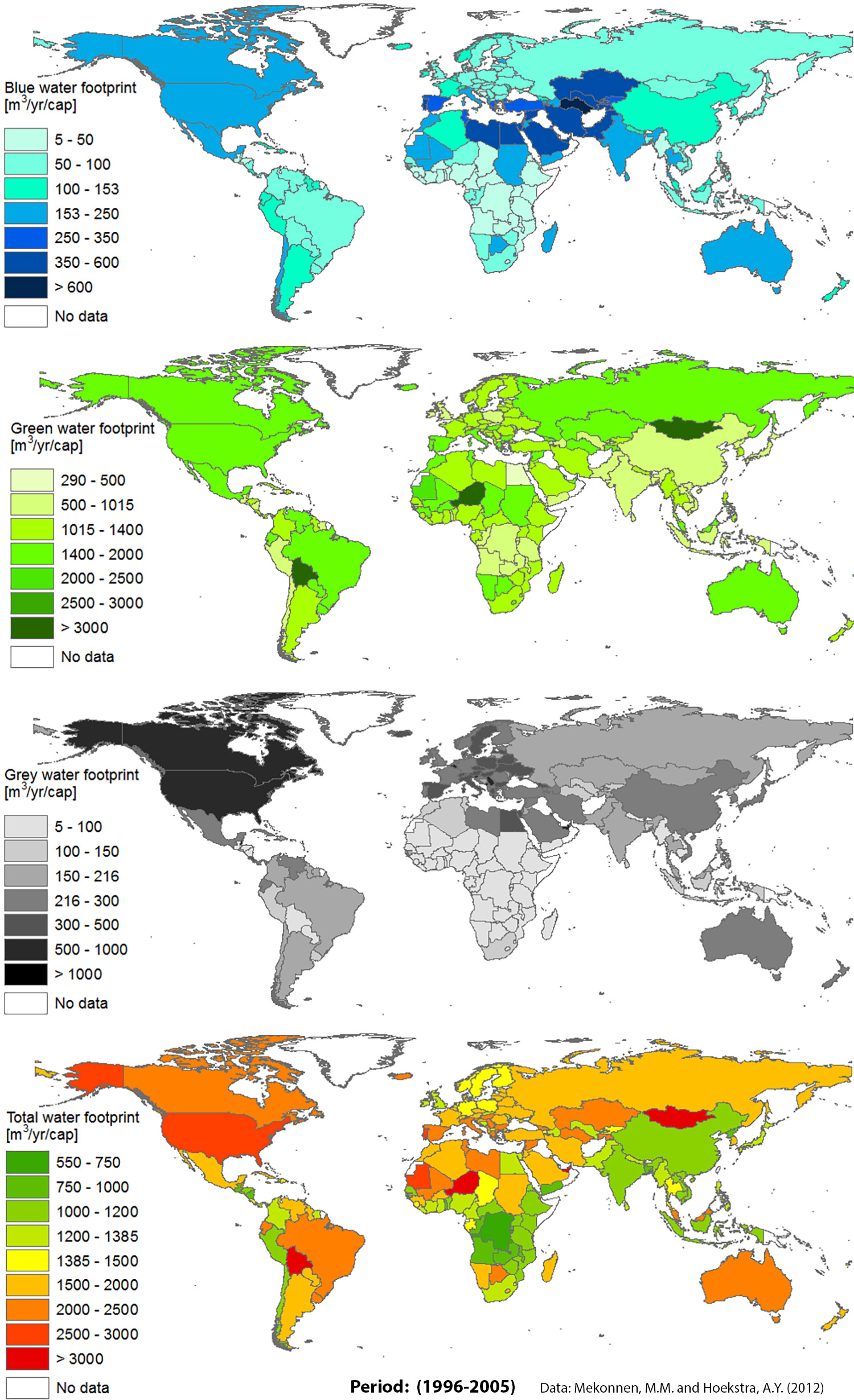 1996년부터 2005년까지 전 세계 물 발자국은 9,087 Gm³/년이었다. 이 중 녹색 물 발자국(빗물)이 74%, 청색 물 발자국(지표수 및 지하수)이 11%, 회색 물 발자국(오염된 물)이 15%를 차지했다.[62] 농업 부문이 전체 물 발자국의 92%를 차지하며 압도적으로 높았고, 공업 생산은 4%, 가정용수 공급은 4%였다.[62]