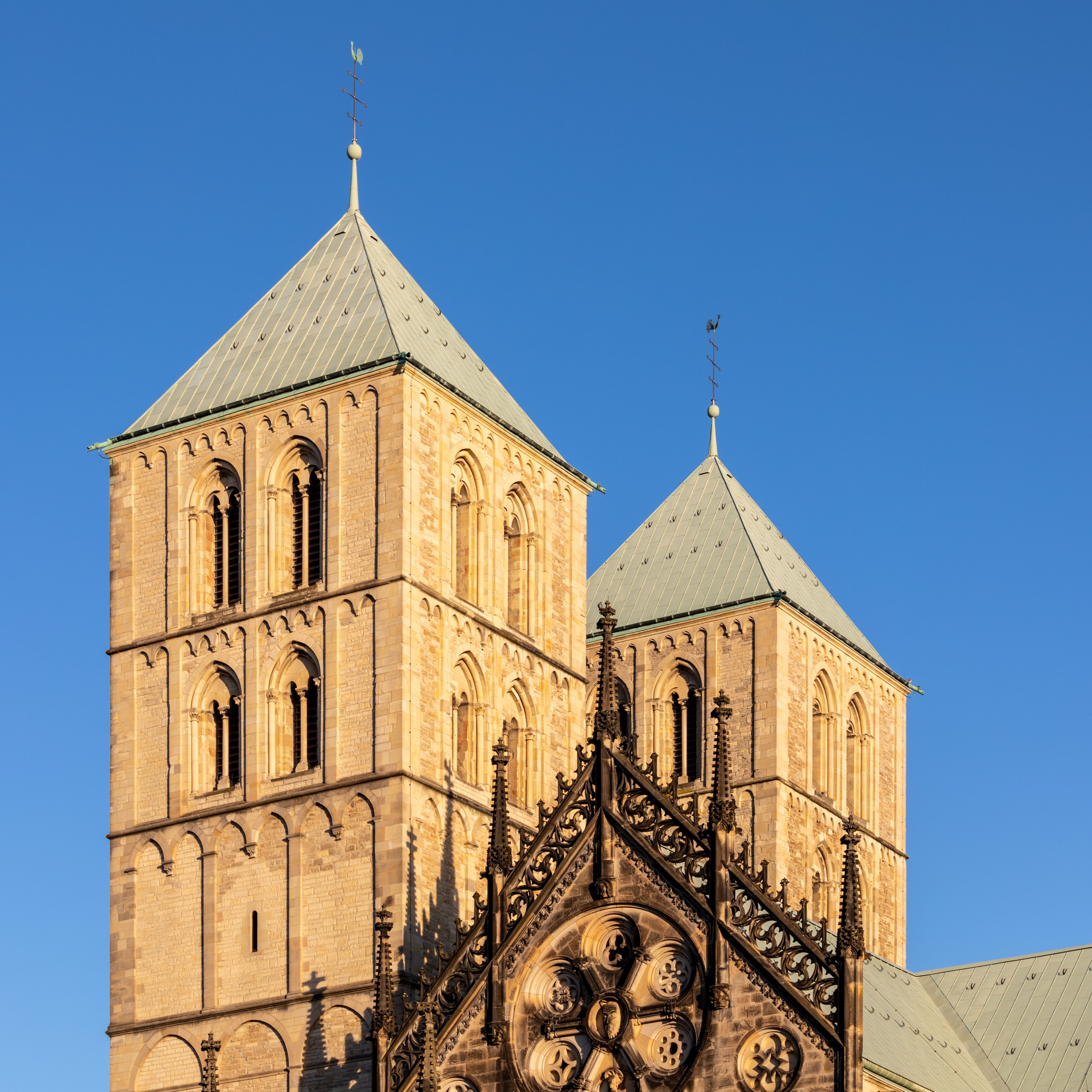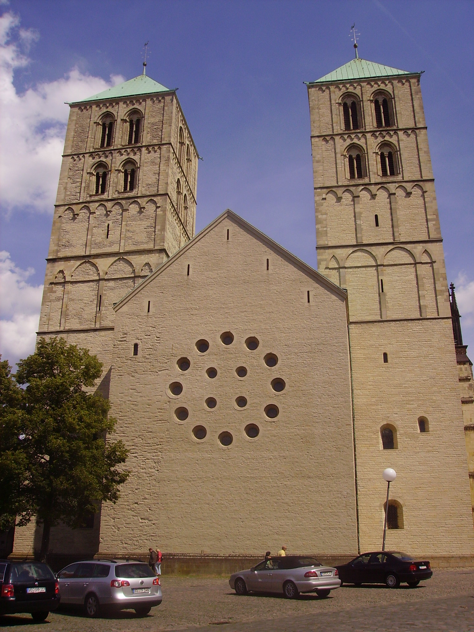 두 개의 로마네스크 양식 서쪽 탑은 언뜻 보기에 동일해 보이지만, 크기가 뚜렷하게 다르다. 북탑(A)에 비해 남탑(C)은 다소 작고 짧다. 탑의 지붕은 피라미드 모양이며 구리로 덮여 있다(1725년 이후).[4]