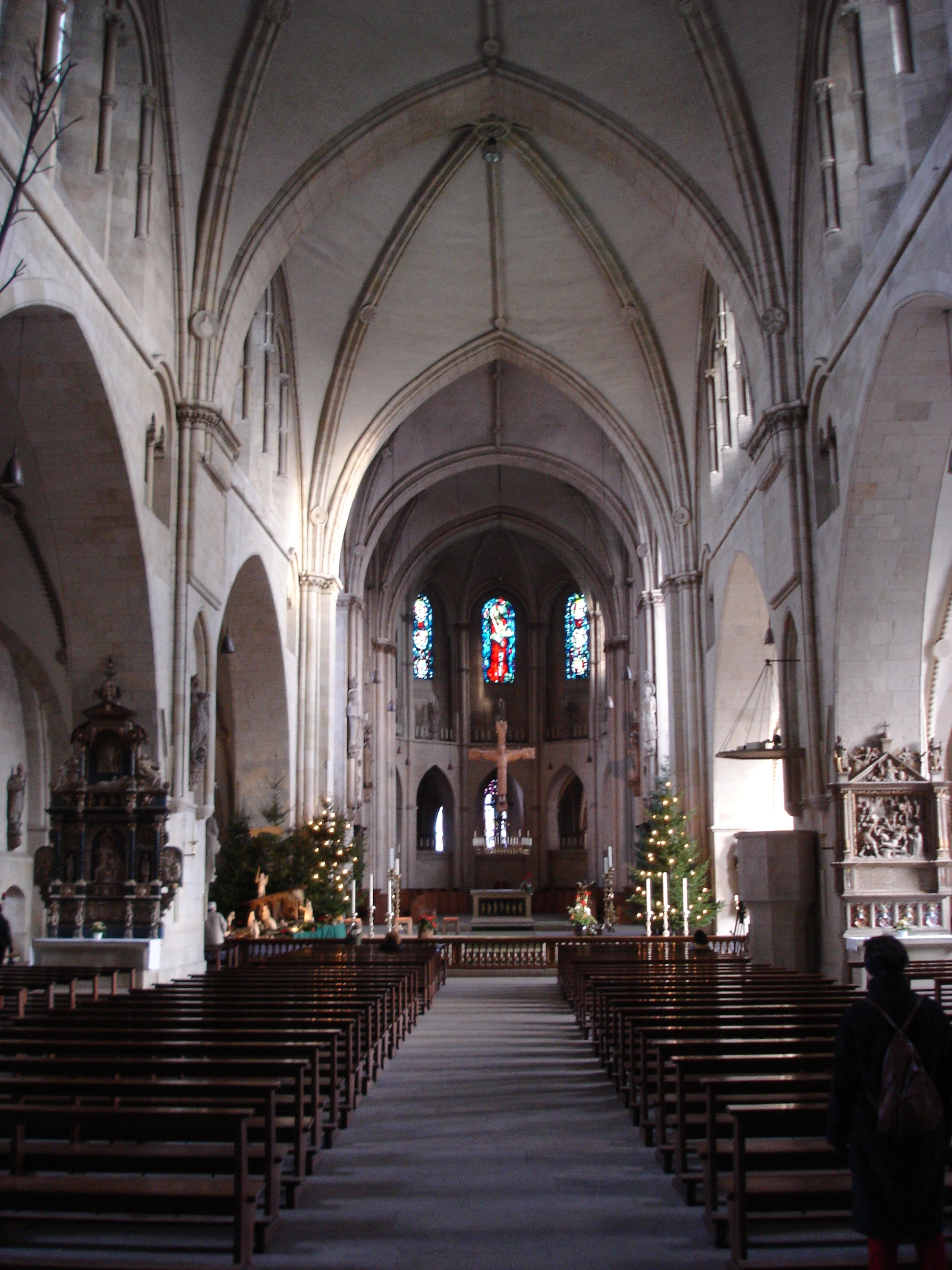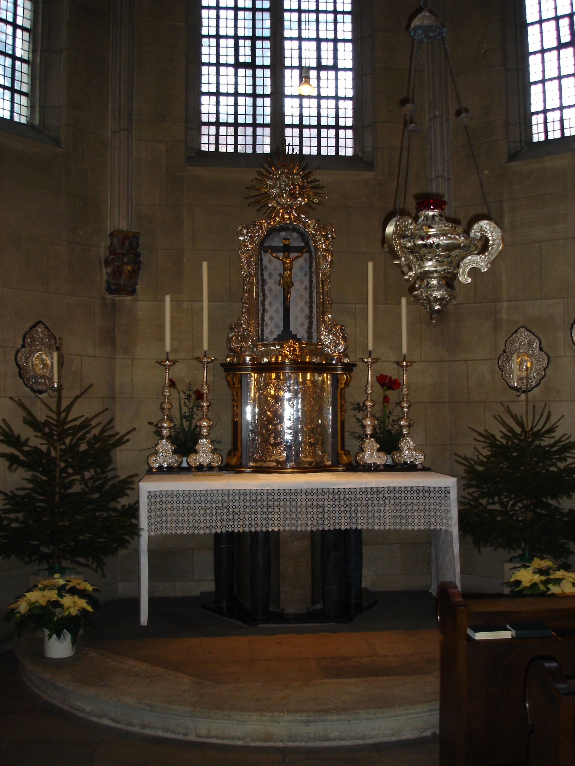 동쪽 익랑에는 제단 섬과 주 제단이 있다. 교차로 아래에는 제단 섬이 있고, 서쪽 끝은 신도석으로 약간 돌출되어 있다. 주 제단은 사암으로 만들어졌으며, 이전 바로크 양식 제단의 유물 안치소에서 가져온 14세기 사도 조각상을 전시하는 진열장을 받치고 있다.제단 섬은 성가대 공간 옆에 있으며, 매달린 나무 십자가 (승리의 십자가)와 동쪽 익랑의 두 팔에 의해 신도석과 구분된다. 성가대는 1956년 에밀 슈테판에 의해 재설계되었다.