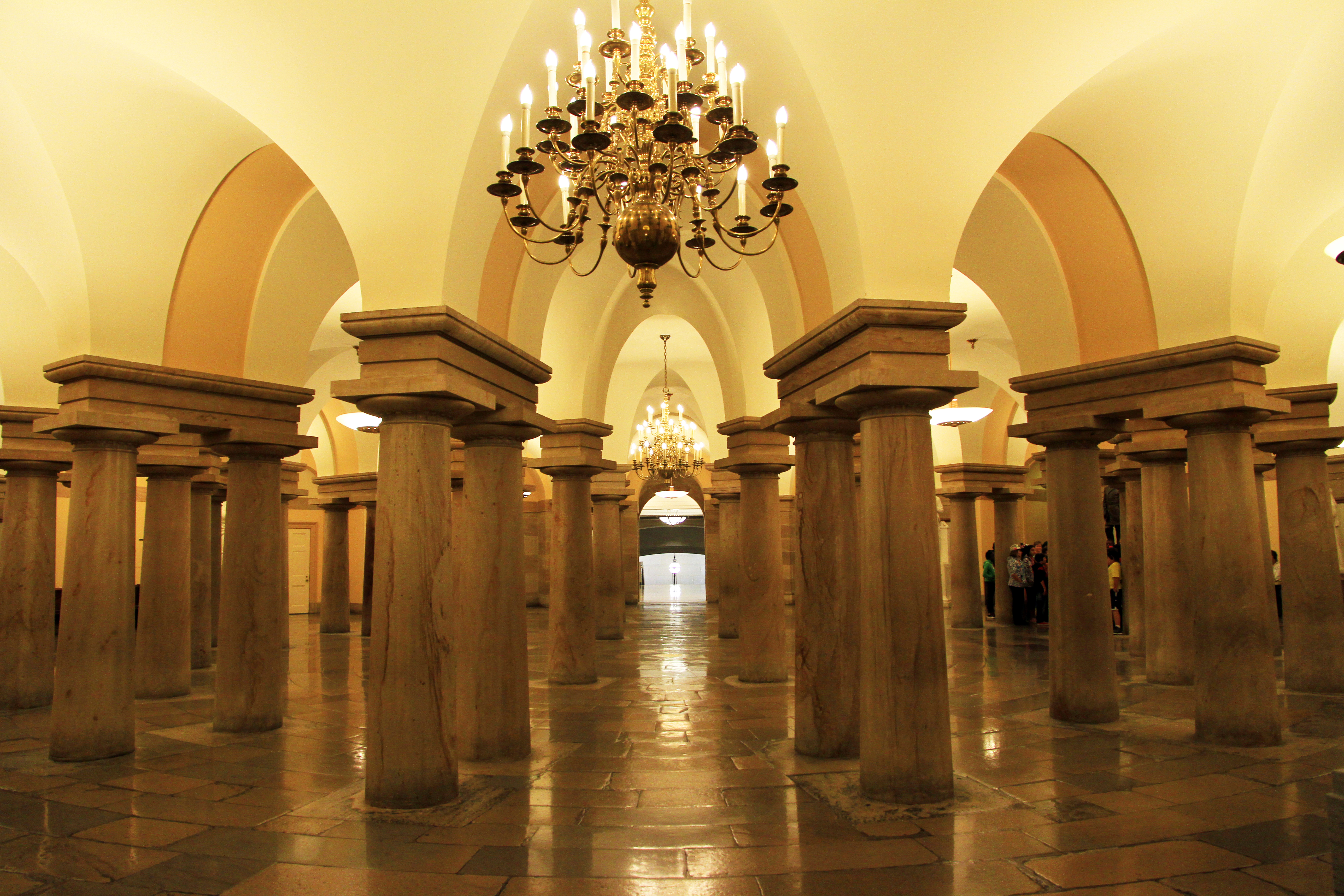 1층에는 지하실(Crypt)로 알려진 공간이 있다. 이곳은 원래 조지 워싱턴의 무덤으로 계획되었으나, 그의 유언에 따라 마운트 버넌에 안장되었다. 지하실 바닥에는 워싱턴 D.C.의 네 구역(NE, NW, SE, SW)을 나누는 기준점이 되는 나침반 별이 박혀 있으며, 국회의사당 역사 관련 전시물과 구존 보글럼이 조각한 거대한 ''아브라함 링컨 흉상''이 있다.[65] 또한, 존 C. 캘훈의 동상도 있는데, 이 동상에는 1998년 미국 국회의사당 총격 사건 당시 생긴 총탄 자국이 남아 있다.