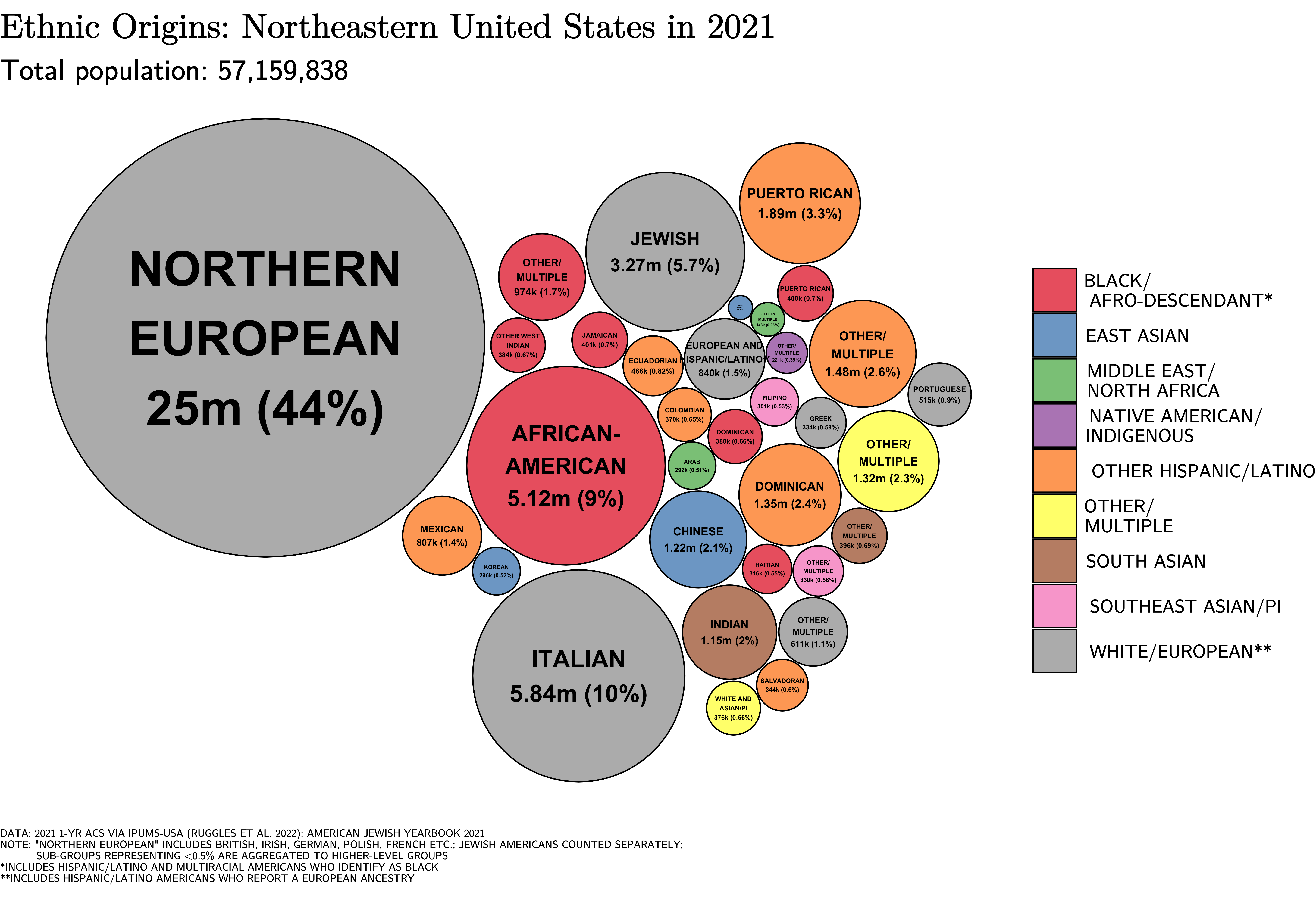 뉴욕주는 1970년대에 캘리포니아주에 인구수에서 추월당한 후, 가장 인구가 많은 주라는 지위를 잃었다. 뉴욕시를 포함한 일부 북동부 도시들은 20세기 중반의 쇠퇴에서 회복되었다.[40] 북동부에는 많은 새로운 정보 및 서비스 산업이 성장하여 21세기에 보스턴, 뉴욕, 필라델피아와 같은 일부 도시에서 호황을 누리고 있다. 하지만 하트퍼드, 시러큐스, 버팔로와 같은 다른 도시들은 21세기에 여전히 쇠퇴하고 있다.[50] 허리케인 샌디는 2012년에 북동부 지역에 큰 피해를 입혀 해안 지역 대부분이 심각한 피해를 입고 내륙 지역에 홍수가 발생했다. 이 허리케인은 뉴저지주에 직접적인 영향을 미쳤고 뉴욕시에 대규모 홍수를 일으켰다.[51]