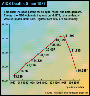 미국에서는 항레트로바이러스제를 포함한 3가지 약물 항-HIV 치료법("칵테일")의 도입 이후 큰 진전이 이루어졌다. 이러한 접근법의 선구자인 데이비드 호는 1996년 ''타임'' 올해의 인물로 선정되었다. 사망자는 절반 이상으로 급격히 감소했으며, 연간 신규 HIV 감염률도 소폭 감소했으나 긍정적인 변화였다. 이 이후로 에이즈 사망자는 계속 감소했지만, 훨씬 느린 속도로 감소했으며, 아프리카계 미국인에게는 다른 인구 집단만큼 완벽하게 감소하지 않았다.[12][13]
