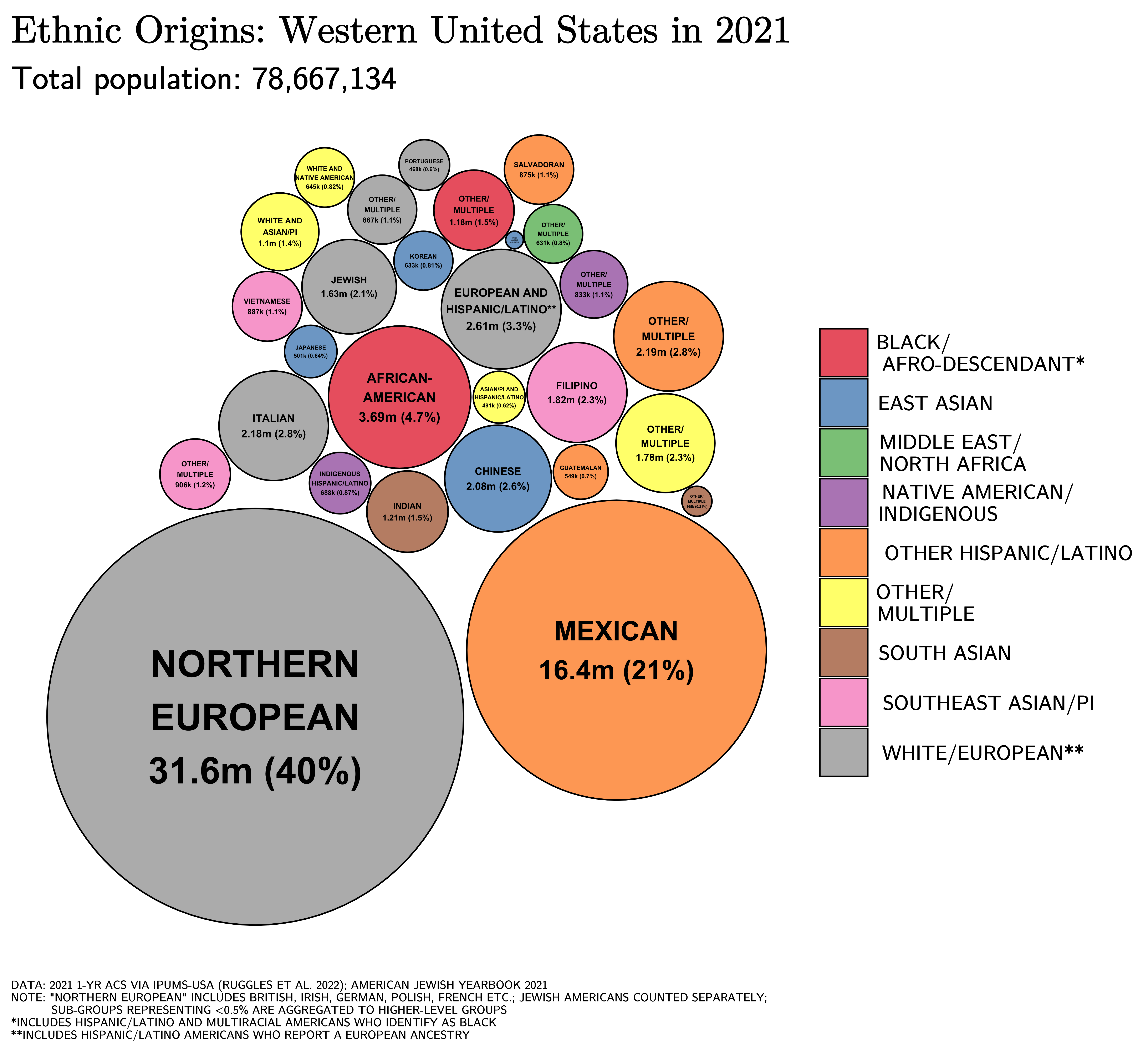 2022년 인구조사국 추정 자료에 따르면, 서부 지역에서 가장 많은 조상을 보고한 사람들은 멕시코계 (24.2%), 독일계 (10.1%), 영국계 (9.5%), 아일랜드계 (7.2%), 이탈리아계 (3.5%), 필리핀계 (3.4%), 중국계 (3.3%)이다.[20][21][22]