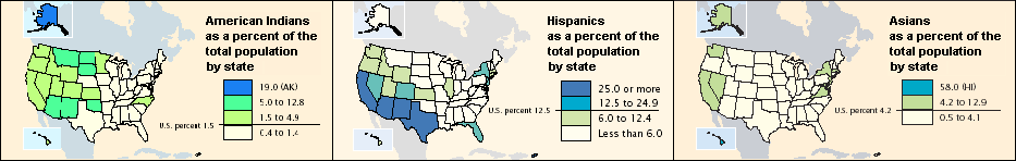 남서부 국경 지역에 위치한 캘리포니아, 애리조나, 뉴멕시코, 텍사스 주는 멕시코계 미국인 인구가 많으며, 과거 멕시코 영토였던 역사를 많은 스페인어 지명이 증명하고 있다. 서부에는 미국의 원주민들도 많이 거주하고 있으며, 특히 산악 주와 사막 주의 대규모 보호구역에 많이 거주한다. 텍사스는 과거 남부의 노예 주였기 때문에, 특히 동부 지역에는 상당수의 이주민이 아닌, 시골에 거주하는 아프리카계 미국인이 살고 있다.