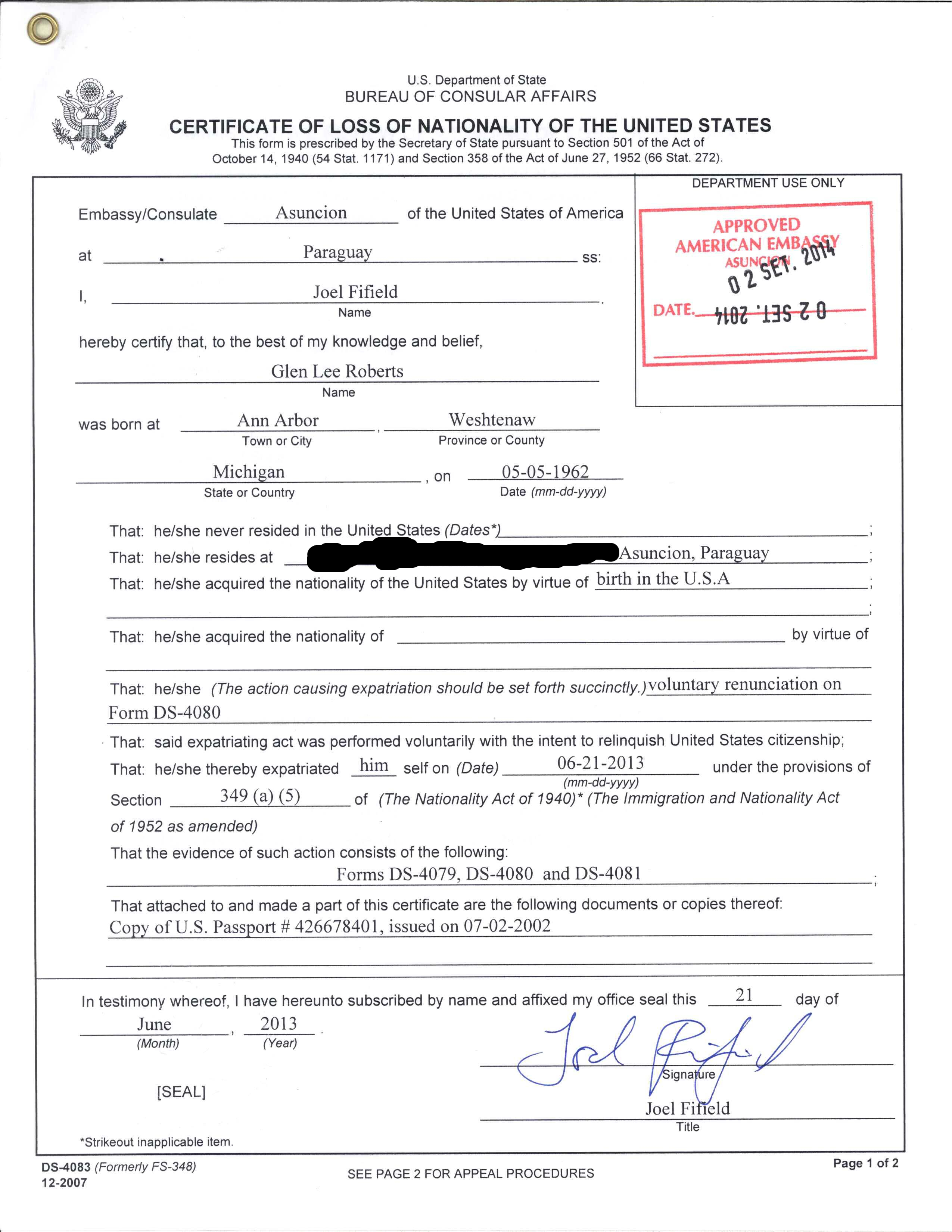 법률 | 미국 국적법 8 U.S.C. 1401, 8 U.S.C. 1481 |