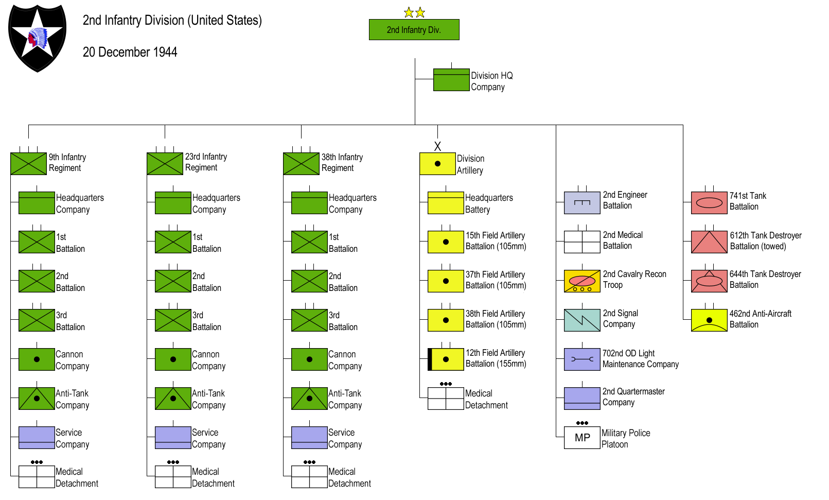 제2보병사단에는 제741전차대대(1944년 6월 ~ 1945년 5월), 제615구축전차대대, 제644구축전차대대, 제462대항공기대대가 배속 지원되었다.[11]