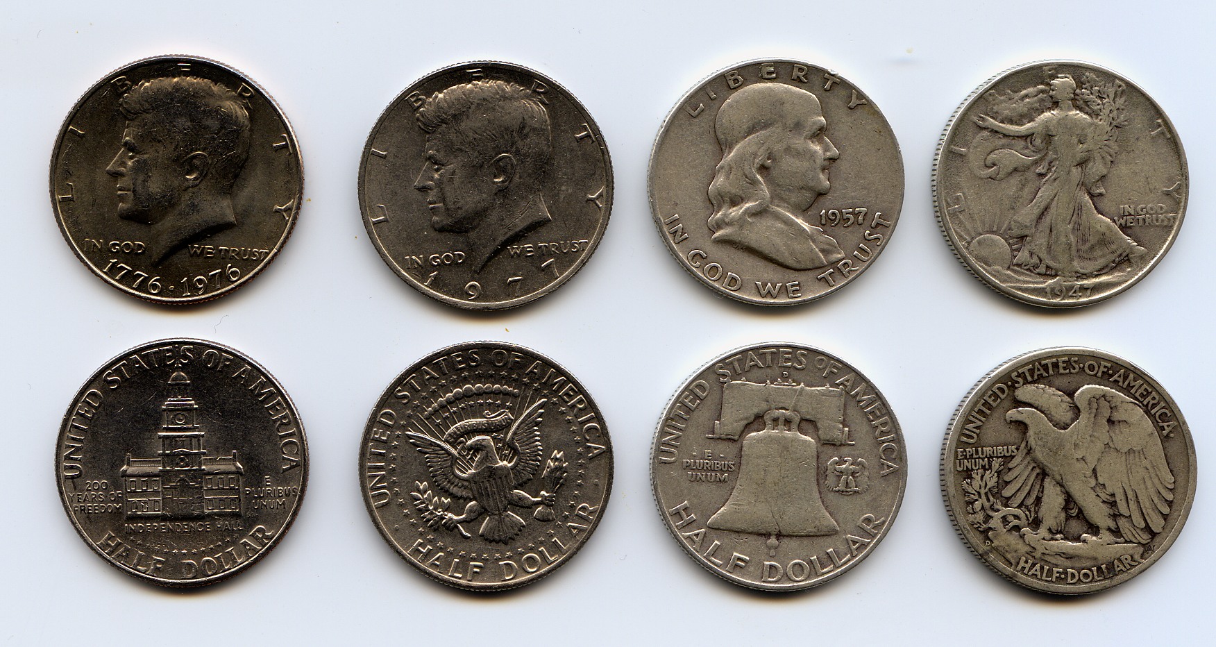 - 프랭클린 하프 달러 (1948년 ~ 1963년): 앞면에 벤저민 프랭클린, 뒷면에 자유의 종을 담아 미국의 독립 정신을 기렸다.