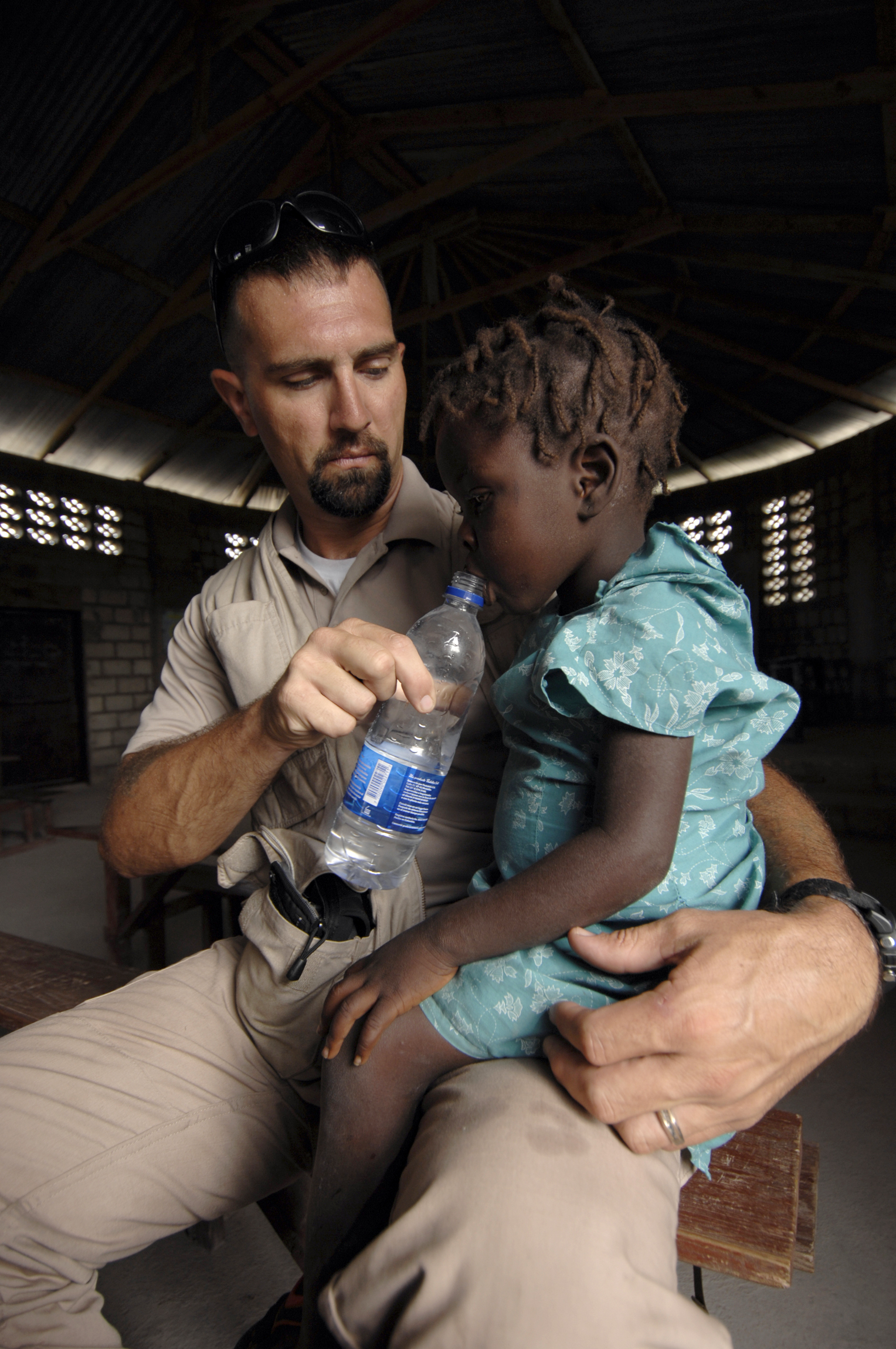 NCIS 특별 수사관이 2008년 아이티에서 허리케인 구호 작전 중 현지 마을의 의료 평가를 하는 동안 USS ''키어사지''에 배속되어 한 소녀에게 물을 주고 있다.
