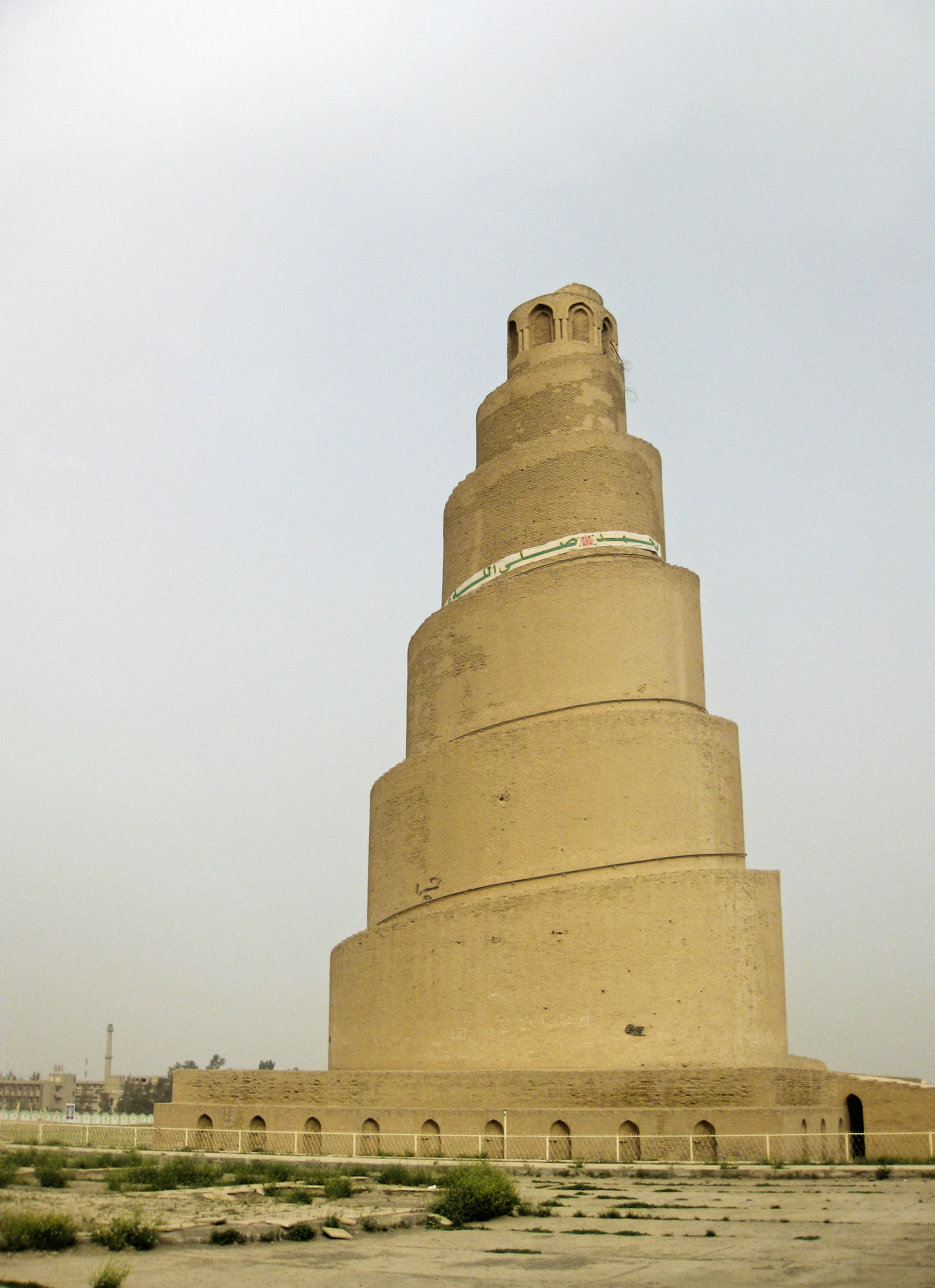 사마라의 대사원(848-852)은 현존하는 가장 오래된 미나레트 중 하나로, 높이가 50m인 원통형 벽돌 탑이다. 나선형 계단이 감겨 있으며, 사원 벽 밖에 세워져 있다. 이는 아바스 왕조 시대 초기의 미나렛 중 가장 높은 건축물이며, 6,000입방 미터가 넘는 벽돌 구조물을 사용하여 세계에서 가장 거대한 역사적인 미나렛으로 남아 있다.[6] 861년에 사마라 근처에 완공된 아부 둘라프 사원에도 비슷한 형태의 작은 미나레트가 있다.[6][46]후기 아바스 시대(11세기에서 13세기)와 셀주크 시대 이후의 미나레트는 일반적으로 원통형 벽돌 탑이었으며, 사각형 또는 다각형의 기단은 사원 자체의 구조에 통합되었다. 주요 원통형 기둥은 좁아지며 발코니를 지지하는 ''무카르나스'' 코니스로 끝을 맺고, 그 위에는 돔으로 덮인 또 다른 작은 원통형 포탑이 있다. 이 스타일의 두 가지 예로는 알-카파핀 사원과 쿰리야 사원이 있다.[41]