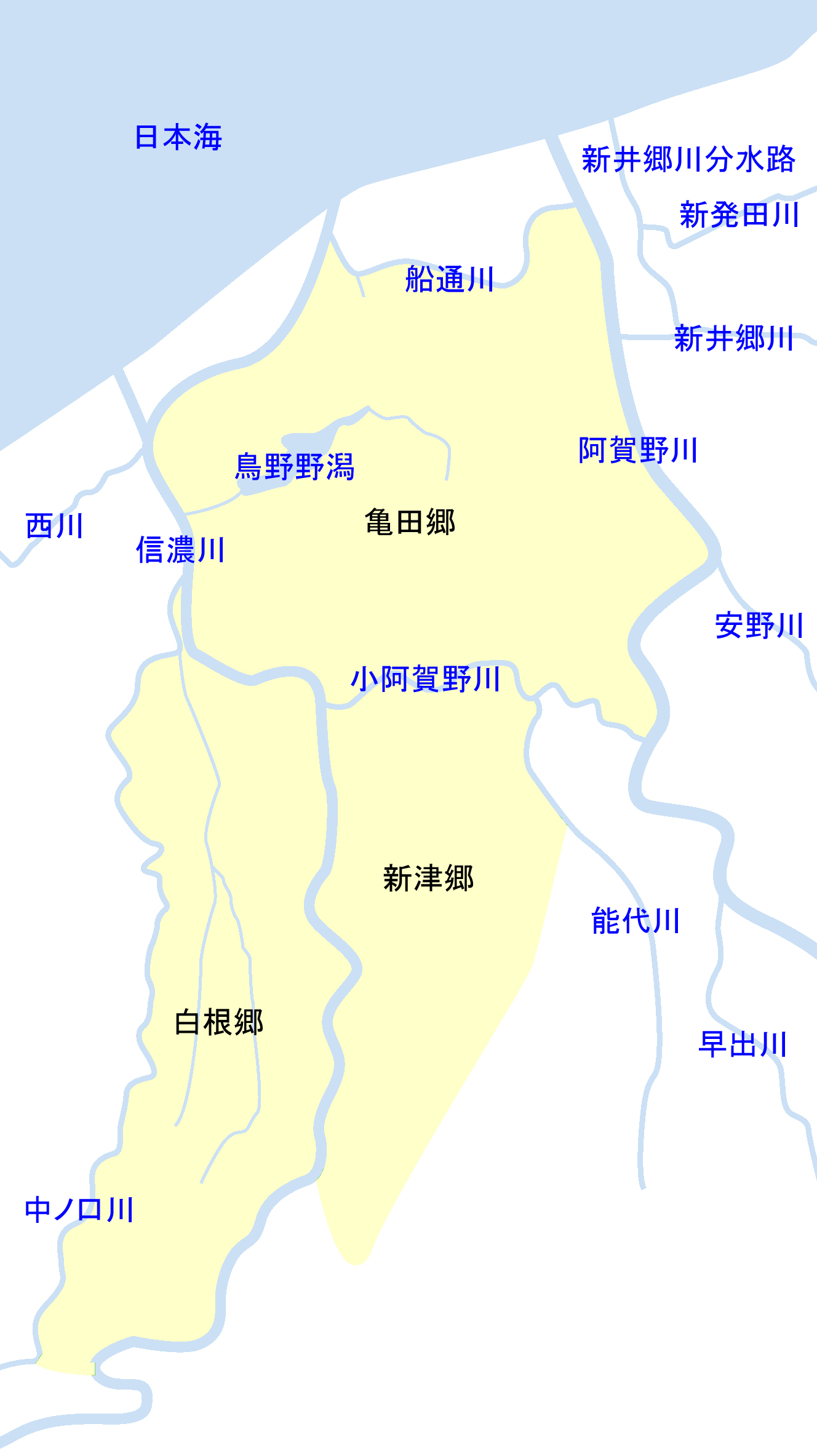 시나노가와 좌안 측에 위치하는 쇼제, 나카노구치가와 우안 측에 위치하는 이바라소네, 지역 남단부의 신이다 등에 큰 마을이 형성되어 있다. 신이다는 옛날 하천 수운의 거점으로 번성했고, 현재도 상점가가 남아있다.[13]4. 5. 아지카타 지역