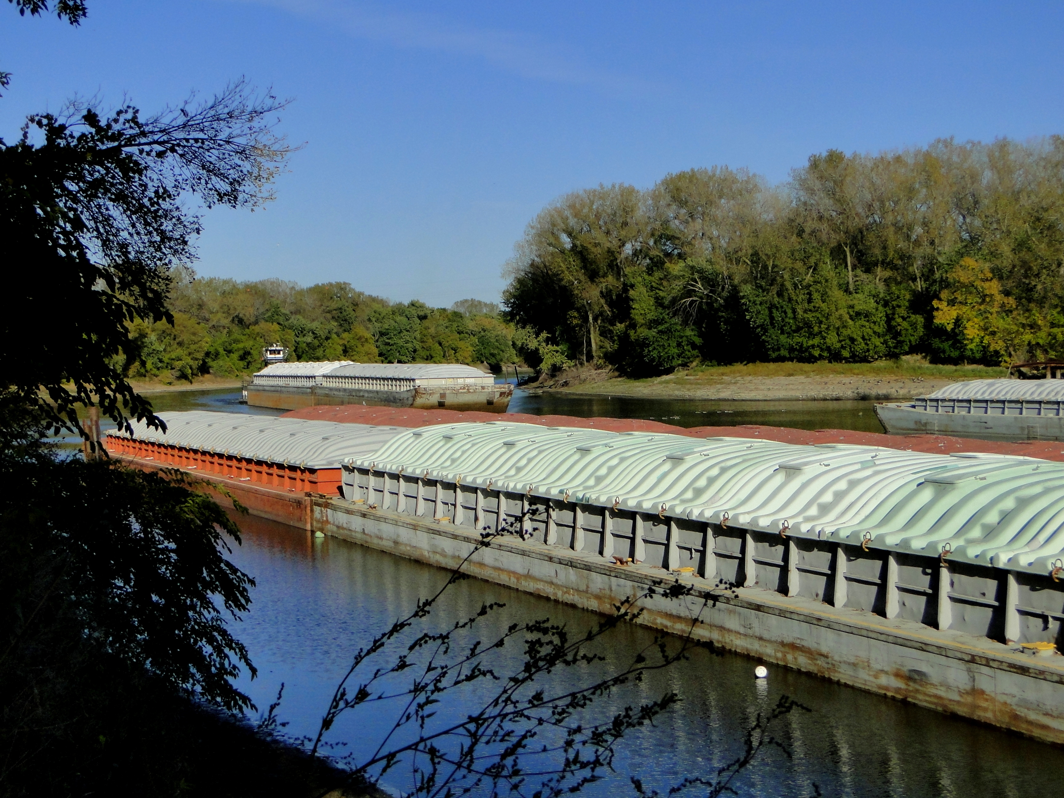 예인선 ''J.L. 플레밍''이 미시시피강의 지류인 미네소타강의 포트 카길로 빈 곡물 바지선을 끌고 가고 있다.