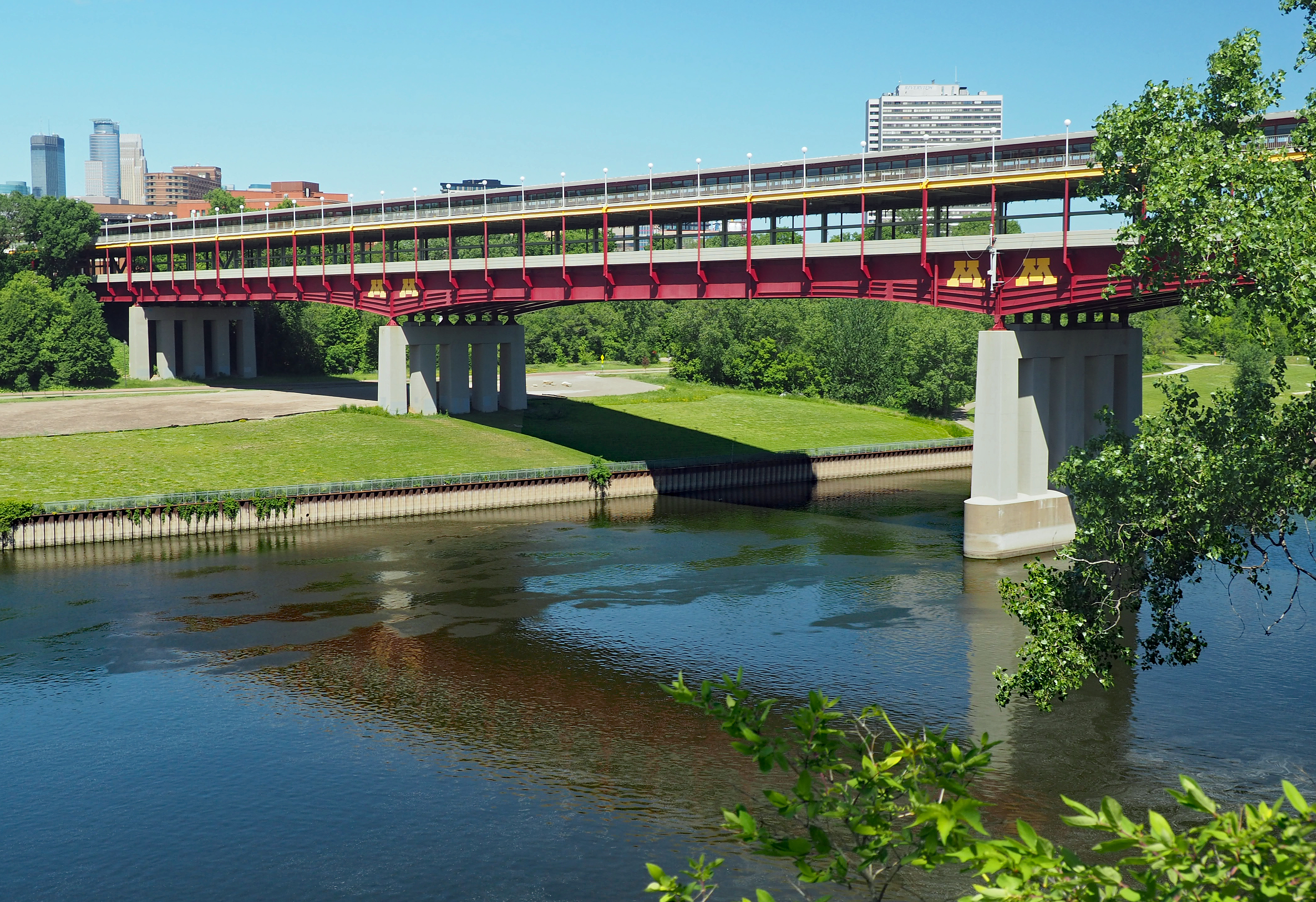 미네소타 대학교 미니애폴리스 캠퍼스는 원래 미시시피 강의 Saint Anthony Falls가 내려다보이는 곳에 있었지만, 나중에 약 1.6km 하류 현재 위치로 이전되었다. 원래 자리에는 현재 유니버시티 애비뉴와 센트럴 애비뉴가 교차하는 지점에 슈트 광장(Chute Square)이라는 작은 공원이 조성되어 있다.[157] 오늘날 미니애폴리스 캠퍼스는 미시시피 강을 사이에 두고 동쪽 강변과 서쪽 강변으로 나뉜다.