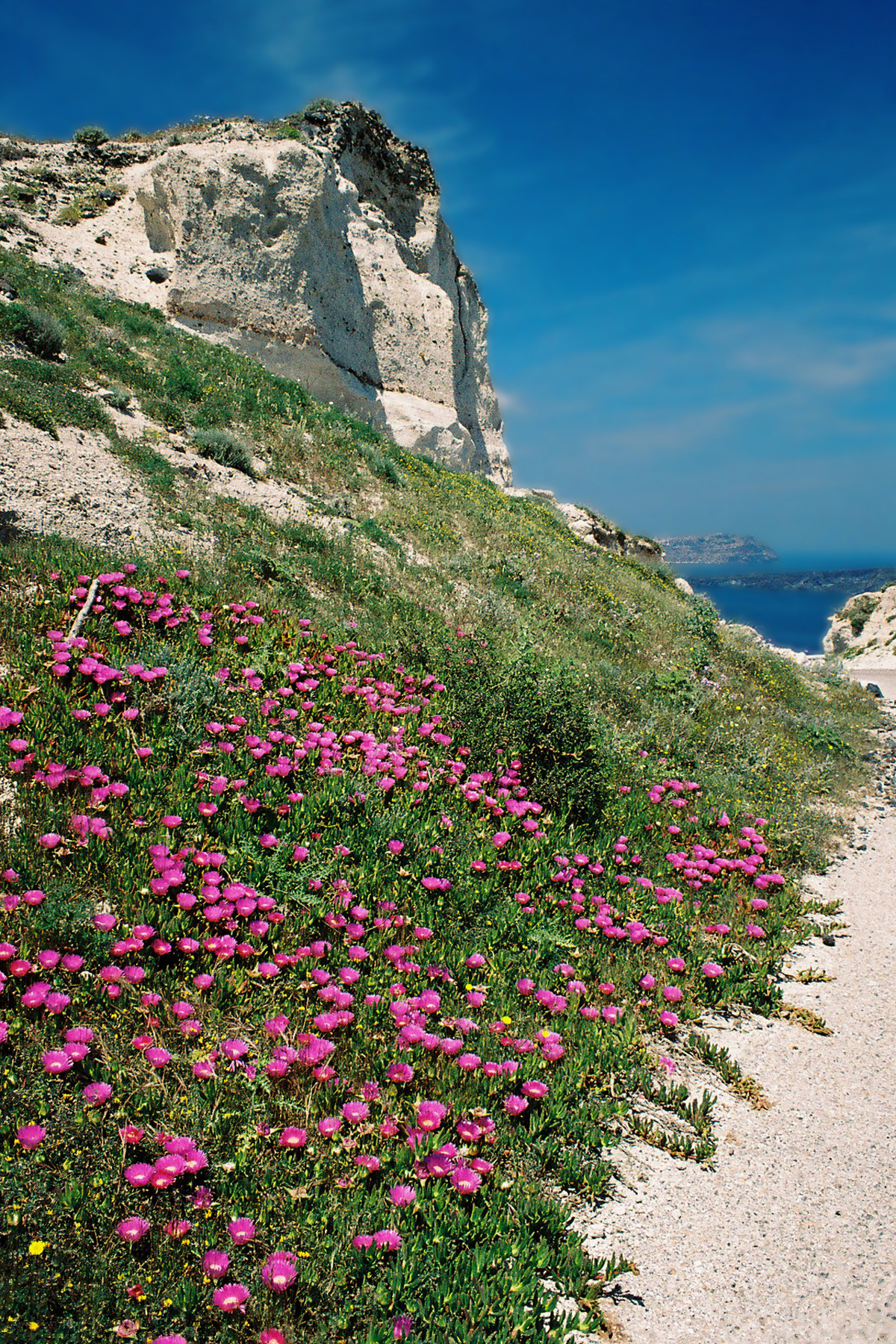 후기 청동기 시대 화산 분화의 초기 단계(기원전 1500년경), 칼데라 섬의 남쪽 경계. 하부의 부석 층은 더 미세하고 거의 흰색이며 암석 침입이 없다.