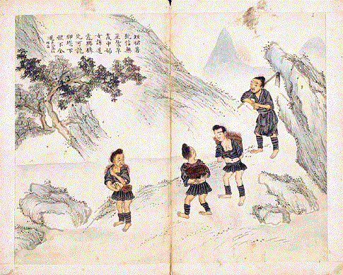 전국 시대 중국 남성들은 킬트와 유사한 짧은 치마를 착용하기도 했다.[2] 진시황릉 병마용에서 볼 수 있듯이, 중국 첫 번째 황제 왕조인 진나라에서는 남성들이 입는 일부 짧은 치마가 허벅지 중간까지 오는 짧은 길이였다.[3] 한족 여성들 또한 yaoqun|요군중국어(腰裙)과 weichang|위상중국어(围裳)과 같은 짧은 외투 치마를 입었지만, 긴 치마 위에 착용해야 했다.[4] 여성들이 미니스커트와 비슷한 옷을 정기적으로 입었던 가장 초기의 문화 중 하나는 중국 묘족의 하위 집단인 duanqun Miao|단군묘중국어(短裙苗, duǎnqún miáo, 짧은 치마 묘족)였다.[5] 18세기 초부터 1912년까지 청나라(1644~1912) 기간에 제작된 앨범에는 duanqun Miao|단군묘중국어 여성들이 "엉덩이를 가까스로 가리는 미니스커트"를 입고 있는 모습이 묘사되어 있다.[5] "묘족 백 그림" 앨범 중 적어도 하나에는 여성들의 짧은 치마와 배꼽이 드러나는 스타일이 이 특정 집단을 식별하는 요소였음을 구체적으로 설명하는 시가 포함되어 있다.[6][7]