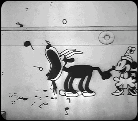 1928년 11월 18일에 개봉된 ''증기선 윌리''는[19] 미키와 미니가 사운드 영화에 처음으로 출연한 작품으로, 두 캐릭터가 "Turkey in the Straw" 멜로디에 맞춰 음악을 연주하는 장면이 나온다.[20]
