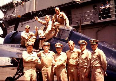 헨리 폰다 | 제독 체스터 W. 니미츠 | 헨리 폰다는 1942년 존 포드의 다큐멘터리 미드웨이 해전의 해설자 중 한 명이었으며, 1976년 영화에 이 다큐멘터리의 일부 영상이 사용되었고, 1965년 영화 인 하름스 웨이에서 니미츠 제독을 모델로 한 이름 없는 제독 역을 맡았다. |
