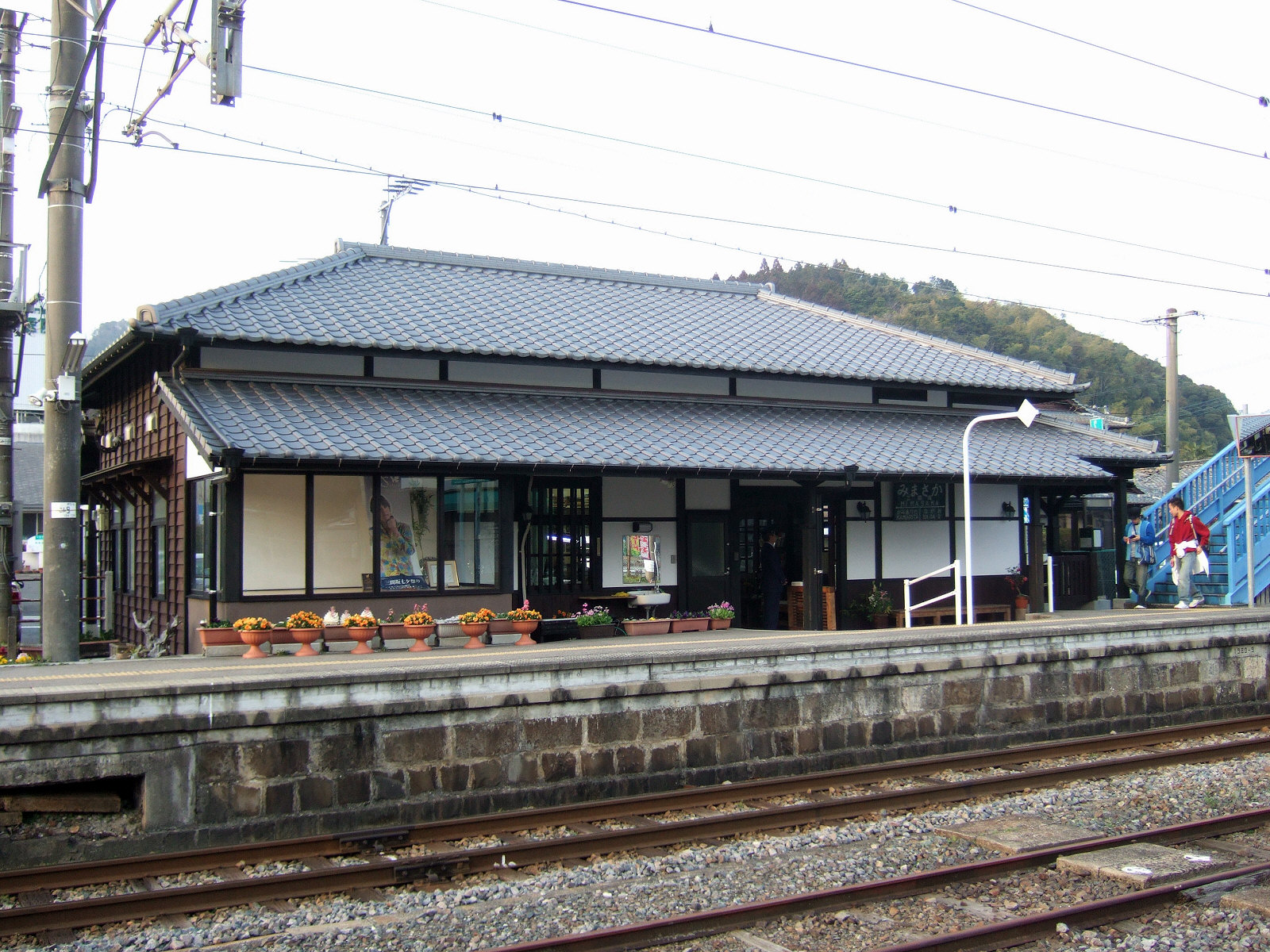 미마사카역은 2면 2선의 상대식 승강장을 갖춘 지상역으로, 오래된 목조 건물이 남아있다.