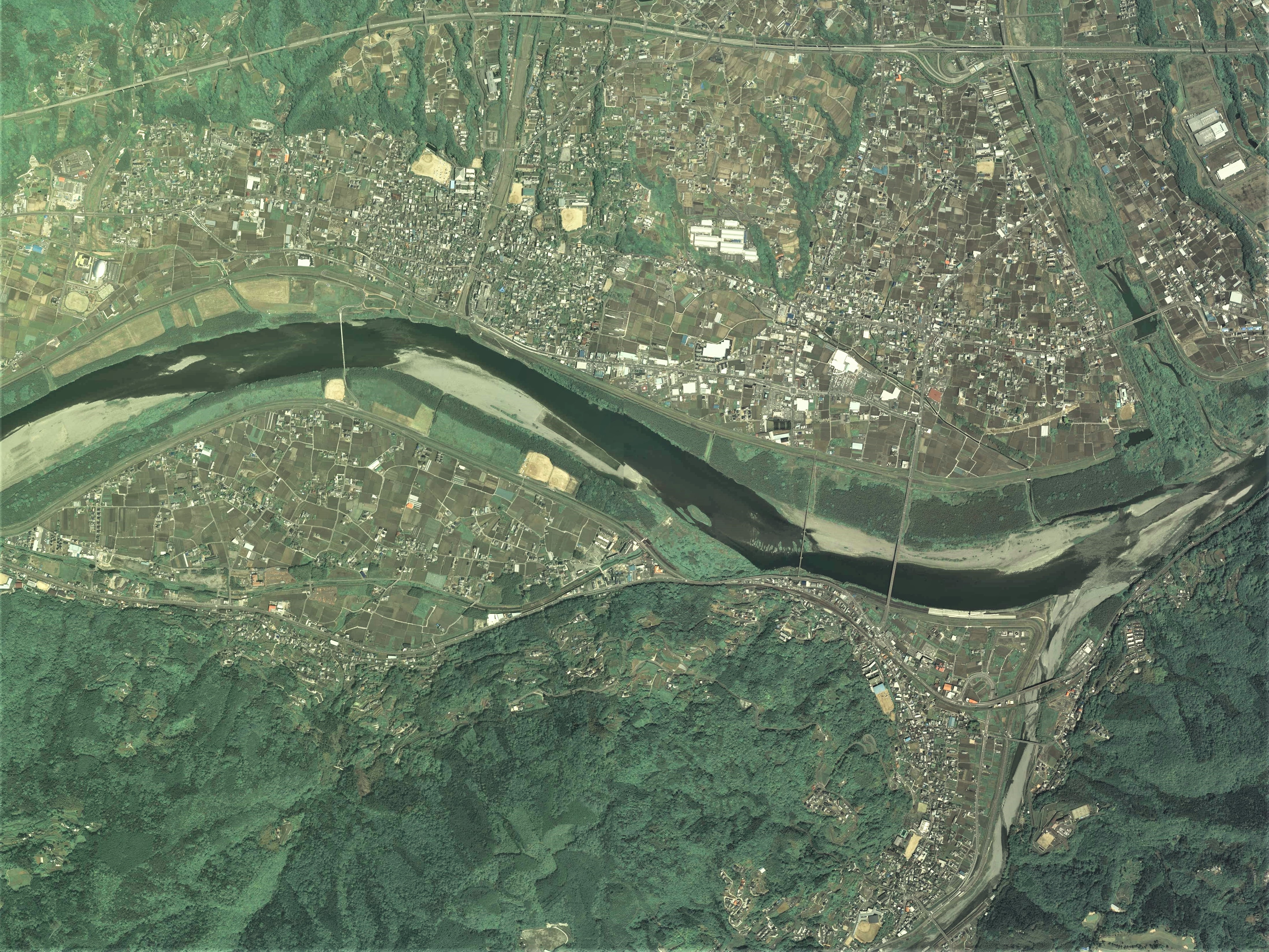 미마시 주요 지역 부근의 항공 사진. 요시노가와를 사이에 두고 북서쪽에 와키마치 지역, 남동쪽에 아나부키 지역이 있다. 2009년 5월 9일 촬영한 4장을 합성하여 작성. 국토교통성 국토지리원 [https://mapps.gsi.go.jp/ 지도·항공사진 열람 서비스]의 항공사진을 바탕으로 작성.