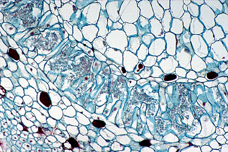식물은 다양한 영양분을 제공하므로 미생물에게 매력적인 숙주이다.[45][46][142][143] 식물에 기생하는 미생물은 식물 표면에 존재하는 착생 미생물(에피파이트)이거나 식물 조직 내부에 존재하는 내생 미생물(엔도파이트)일 수 있다.[45][46][142][143] 난균류와 균류는 수렴 진화를 통해 유사한 형태를 발달시켰으며 유사한 생태적 지위를 차지한다.[142][143] 이들은 숙주 세포를 관통하는 실 모양의 구조인 균사를 발달시킨다.[142]