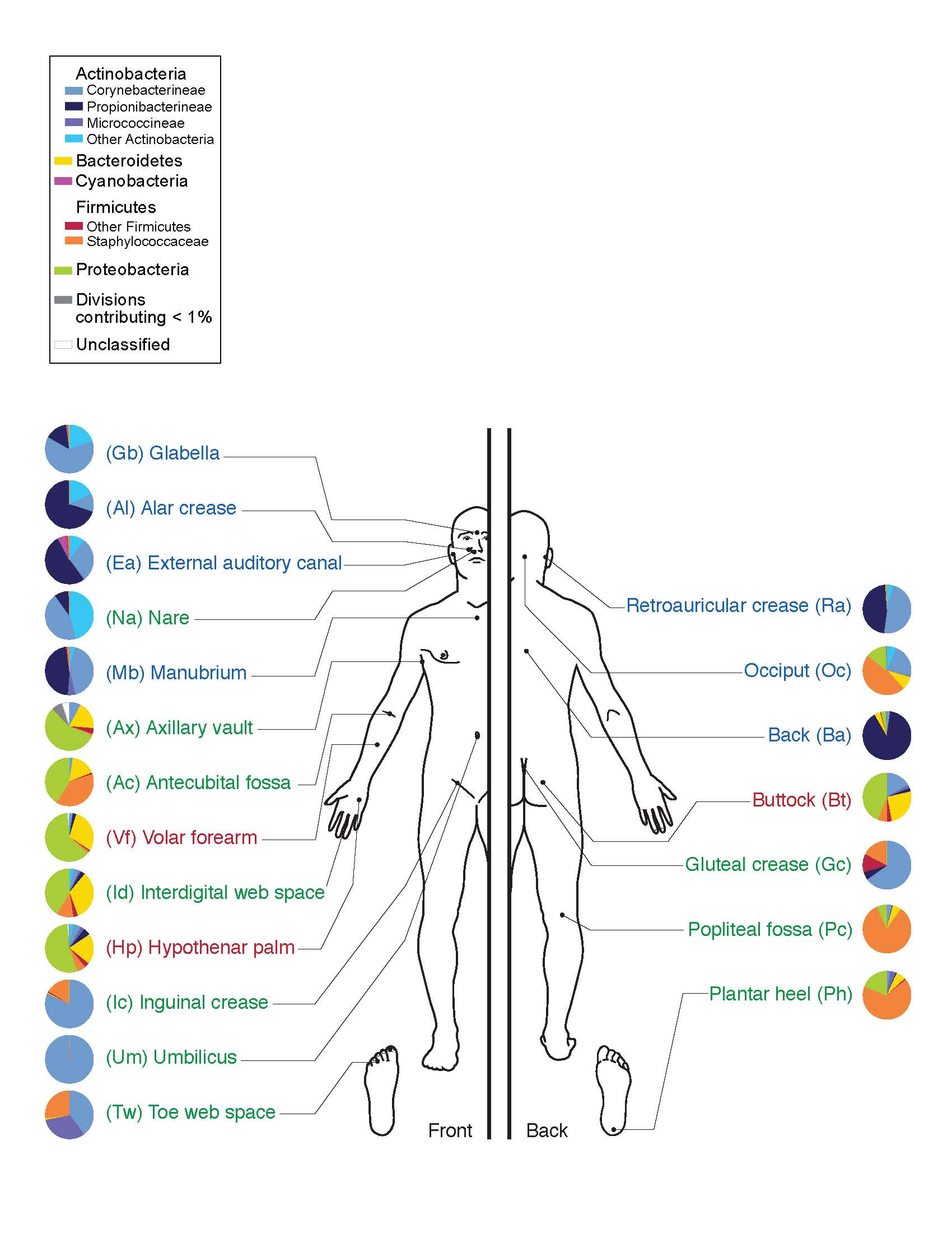 사람의 미생물군집은 장관, 구강, 피부, 질과 같은 부위별로 구성하는 세균 종이 다르다. 예를 들어 타인 간의 장내 미생물군유전체를 비교했을 때 동일 인물의 장관과 구강 미생물군유전체를 비교한 경우보다 유사성이 더 높다.[130][131]