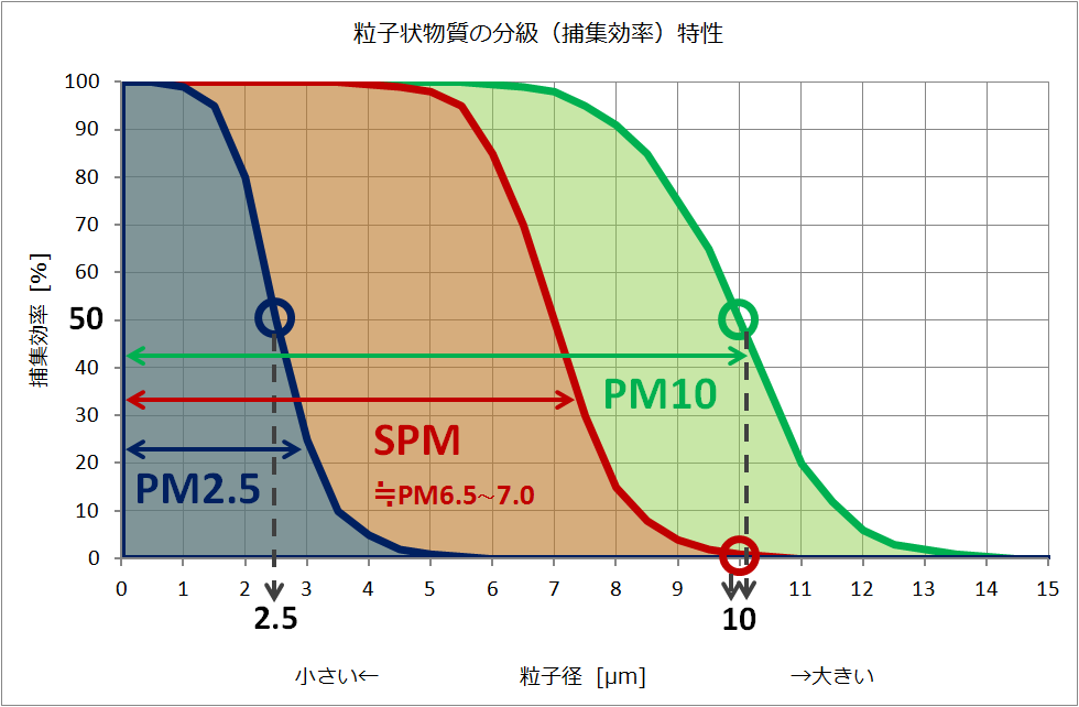 환경 기준이 설정되기 시작한 초기에는 검댕[311]이나 총 부유 입자상 물질(TSP[312]) 등의 기준치가 채택되었다. 예를 들어, 미국에서 1971년에 설정된 최초의 환경 기준에서는 TSP의 기준치만 설정되었다[313]. 그러나 TSP에는 거의 사람이 흡입하지 않는 수십 µm의 큰 미세 입자가 포함되어 있었기 때문에, 사람이 흡입하는 더 작은 미세 입자로 초점을 옮겨 PM10과 PM2.5가 새로운 기준으로 채택되고 있다[314][315]. 이 점에서 일본은 1972년에 설정된 최초의 환경 기준이 SPM(≒PM6.5 - 7.0)이었고, 초기부터 작은 미세 입자를 채택했지만, PM2.5에 관해서는 환경 기준 설정이 늦어 세계적으로 채택되기 시작한 1997년부터 12년이 지난 2009년에야 비로소 설정되었다.[397]