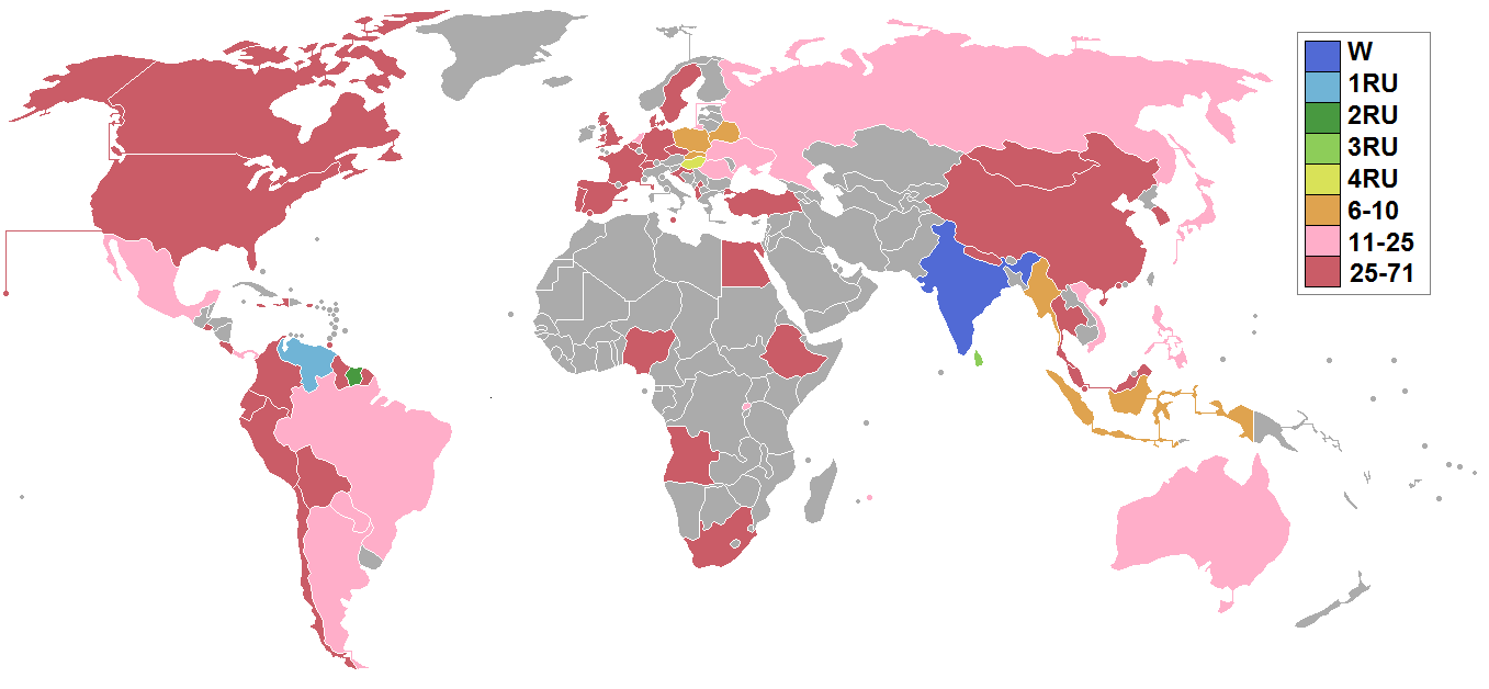 철회 국가 | 아루바 중화 타이베이 퀴라소 도미니카 공화국 적도 기니 에스토니아 가봉 가나 조지아 홍콩 아이슬란드 아일랜드 이스라엘 이탈리아 케냐 라트비아 룩셈부르크 모로코 뉴질랜드 북아일랜드 노르웨이 |