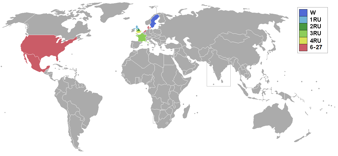 첫 참가 국가 | 덴마크 프랑스 네덜란드 멕시코 스웨덴 잉글랜드 스코틀랜드 북아일랜드 미국 |